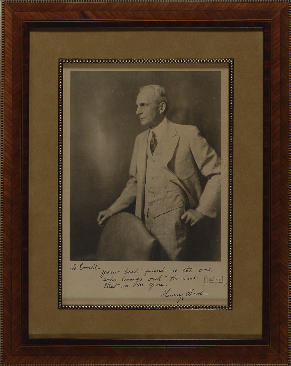 Outstanding vintage matte-finish 8 x 11.5 Bachrach portrait, signed and inscribed in fountain pen “To Emil, your best friend is the one who brings out the best that is in you. Henry Ford.” Nicely suede matted and framed to an overall size of 13.75 x 17.5. An area of scattered light surface marks and loss to right edge near Ford’s elbow, and some other scattered light surface marks and flecks of surface loss, otherwise fine condition.