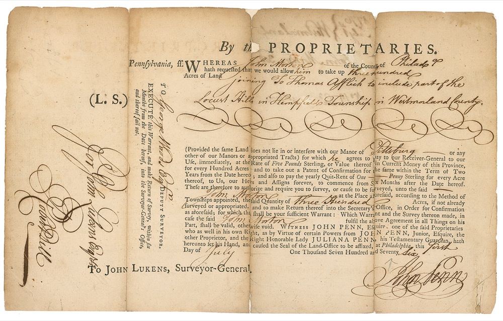 Signer of the Declaration of Independence from Pennsylvania (1724–1777). Ink docketing signature, “John Morton,” and dated in another hand [month whited out], 4th, 1776, with another date of July 1, 1776, at the top, on the reverse of a land grant issued to Morton on July 1, 1776. In good condition, with document having been professionally silked on the reverse lightly affecting signature, reinforcement along three vertical folds, scattered toning and soiling, scattered creases, and a couple small areas of paper loss. Pre-certified John Reznikoff/PSA/DNA and RRAuction COA.
