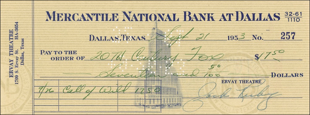 Dallas nightclub owner (1911–1967) who attained infamy for shooting and killing Lee Harvey Oswald on November 24, 1963, two days after Oswald was arrested for the assassination of John F. Kennedy. Ervay Theatre business check, 8 x 3, filled out in another hand and signed by Ruby, payable to 20th Century Fox for $17.50, September 21, 1953. Memo line reads, “Call of Wild.” In fine condition, with cancellation stamps to body, none affecting clean signature area. Pre-certified PSA/DNA and RRAuction COA.