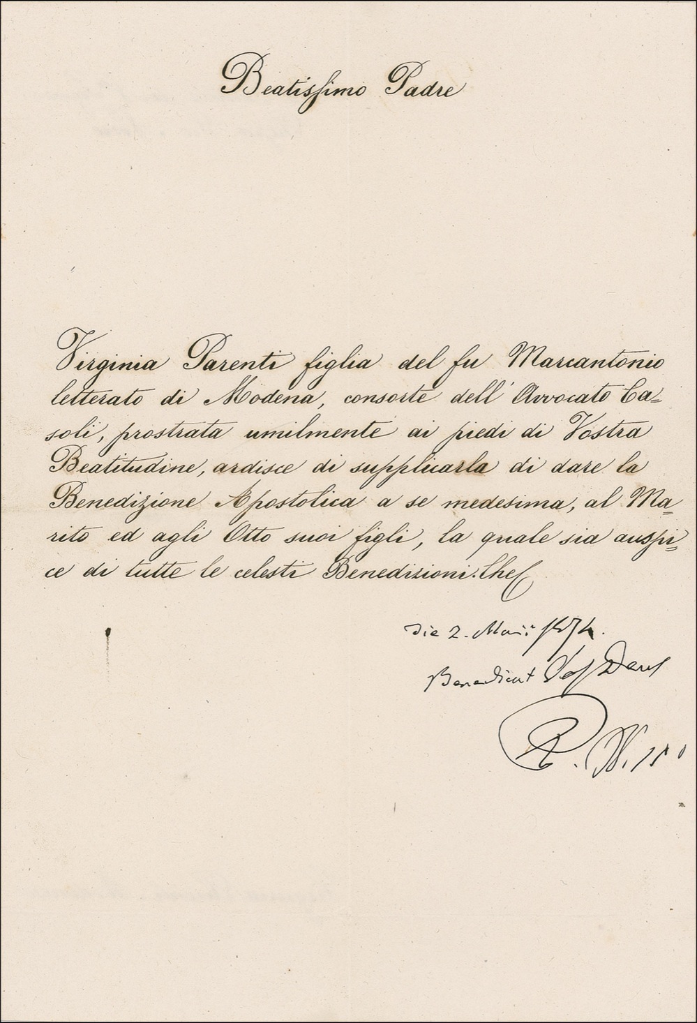 Italian pope (1792–1878), born Giovanni Maria Mastai-Ferretti, who ascended the papal throne in 1846 and served until his death. Among the notable achievements of his 32-year reign, the longest in Roman Catholic Church history, Pius convened the historic First Vatican Council, which included the doctrine of papal infallibility. Manuscript DS, in Italian, signed “P. pp IX,” one page, 8.75 x 12.75, 1874. Untranslated blessing signed at the conclusion by Pius, who adds the date and a brief sentiment above his signature. Intersecting folds, some scattered light toning, and some scattered light spreading to ink in text, otherwise fine condition. RRAuction COA.