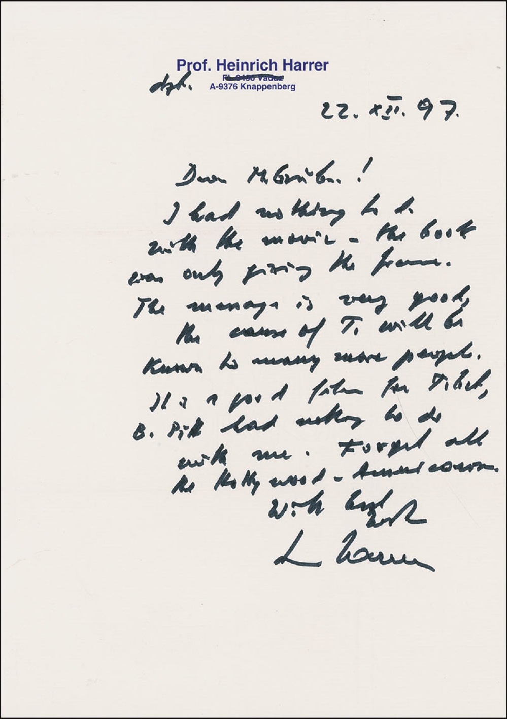 ALS, one page, 8.25 x 11.75, personal letterhead, December 22, 1997. Harrer discussed the autobiographical movie, Seven Years in Tibet. In part: “I had nothing to do with the movie, the book was only giving the frame. The message is very good, the cause of T. will be known to many more people. It is a good film for Tibet. B. Pitt had nothing to do with me.” In fine condition with intersecting mailing folds. Accompanied by a 4.25 x 5.75 color portrait signed in black felt tip and an unsigned photo of Harrer at a movie premiere. RRAuction COA.