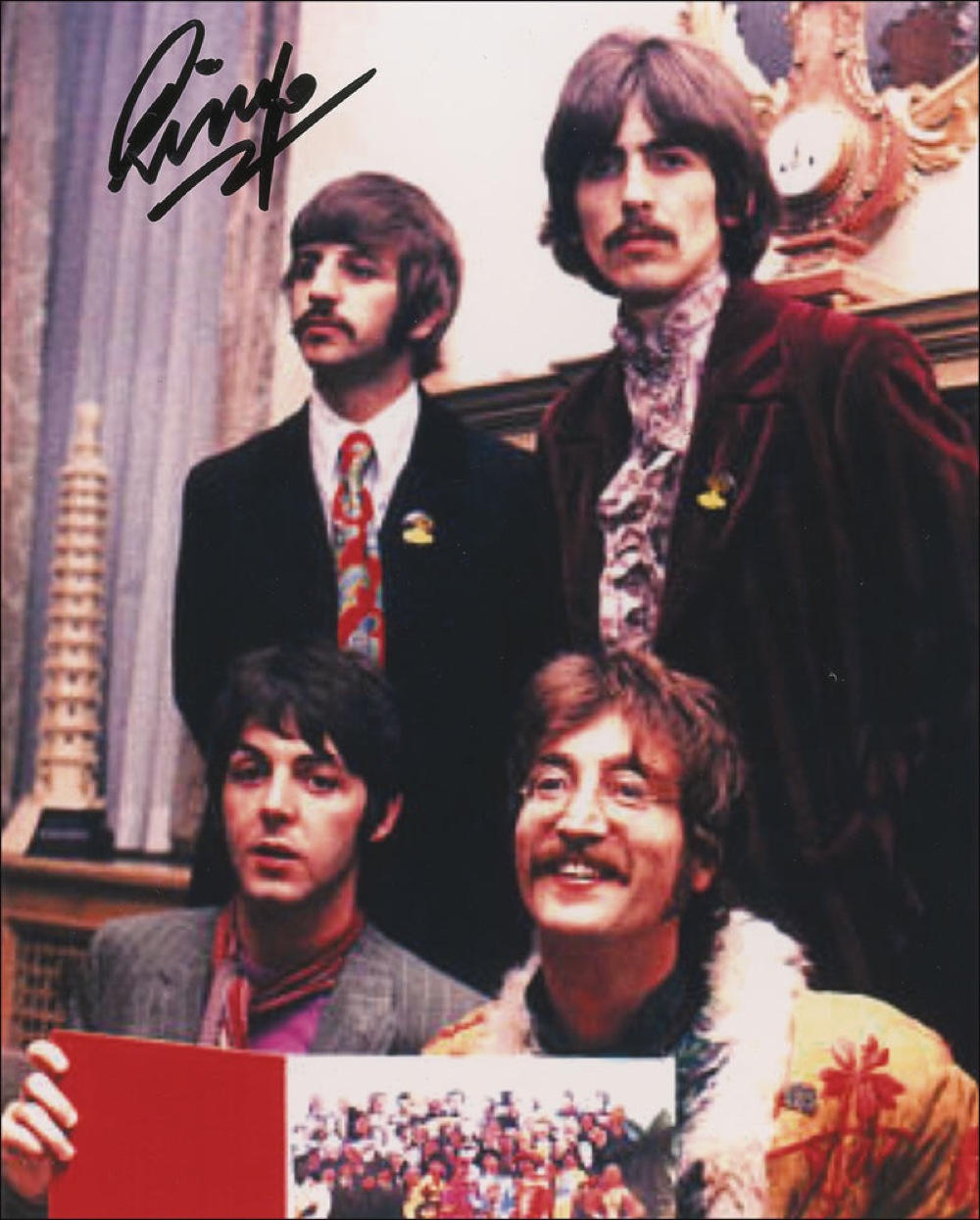 Color glossy 8 x 10 photo of Ringo posing with the rest of the Beatles, signed in black felt tip, “Ringo.” In fine condition, with a few trivial edge dings. Pre-certified Roger Epperson/REAL and RRAuction COA.