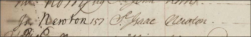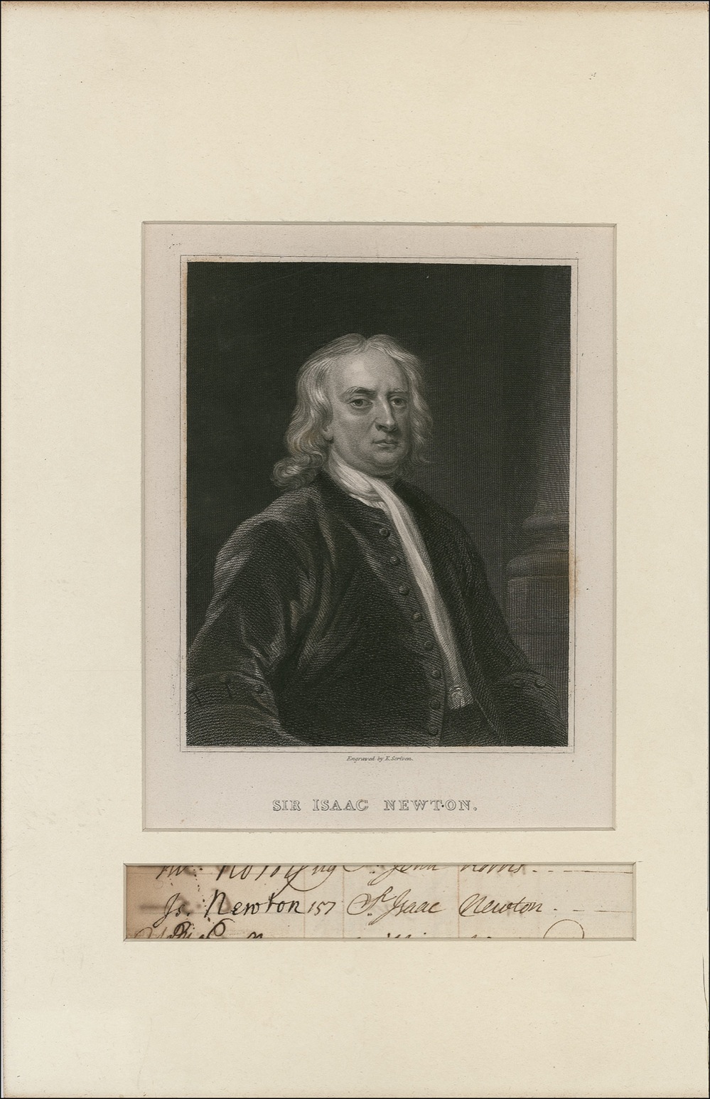 English physicist, mathematician, and astronomer (1643–1727), widely regarded as the most influential figure in the history of science, whose ideas and discoveries, including calculus, the laws of gravitation and motion, and observations on the nature of light and optics, earned him a place among the most profound geniuses in the history of mankind. Partial manuscript DS, signed “Is. Newton,” one page, 10.25 x 2.75, no date but noted in pencil in another hand as 1718. Partial financial registry page apparently listing payments made by or to several men and signed in the left column by each next to their respective name and amount. Newton has signed "Is. Newton" in acknowledgment of £1000. Document has been folded so that Newton’s signature is prominently displayed, then matted with an engraved portrait of Newton, to an overall size of 7.25 x 11.5. In very good condition, with toning over first portion of signature, as well as a couple stray ink marks.