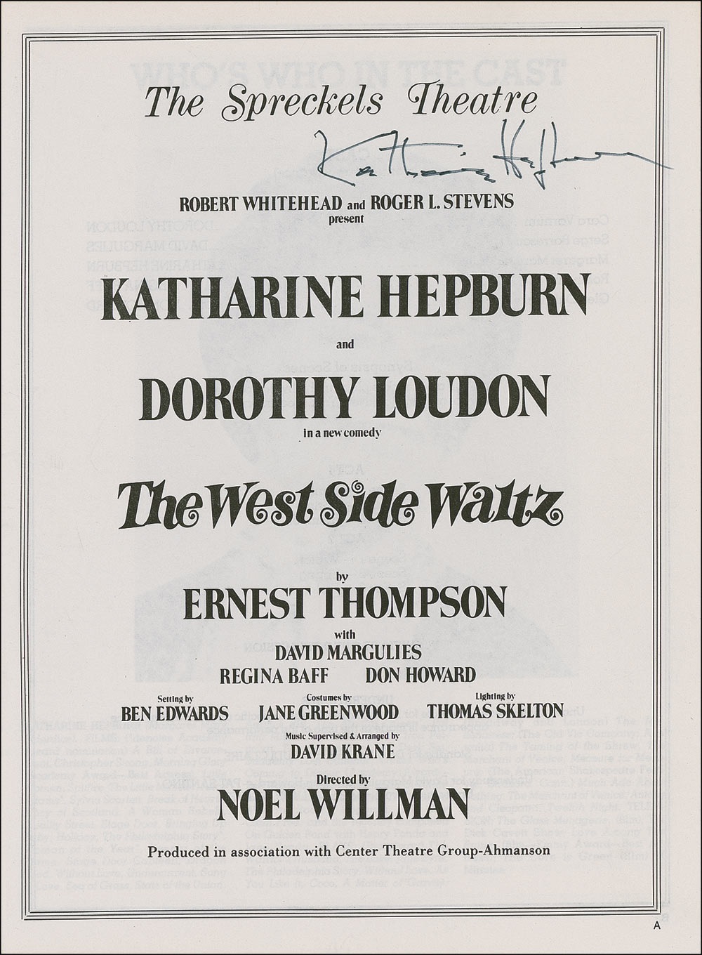 Program from the Spreckels Theatre presentation of The West Side Waltz, starring Hepburn and Dorothy Loudon, 8.5 x 11, 8 pages. Signed on the front cover in black felt tip. In fine condition. Pre-certified PSA/DNA and RRAuction COA.