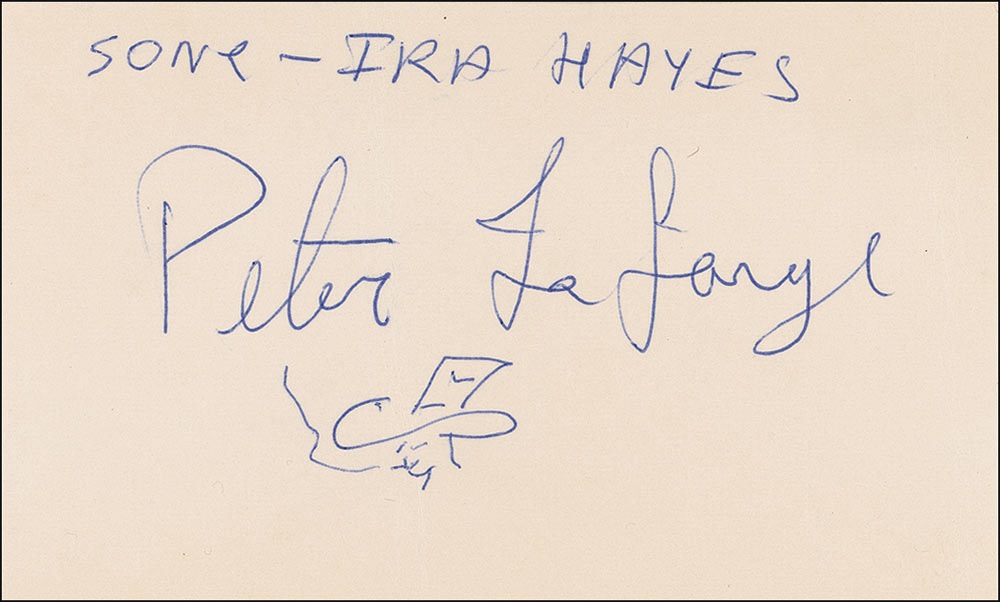Folksinger and songwriter (1931–1965) known for his affiliation with Bob Dylan and Johnny Cash as well as his song, “The Ballad of Ira Hayes.” Ballpoint signature, “Song–Ira Hayes. Peter LaFarge,” with a small self-portrait on an off-white 5 x 3 card. Accompanied by the original mailing envelope postmarked February 26, 1965. In fine condition, with a vertical crease. RRAuction COA.