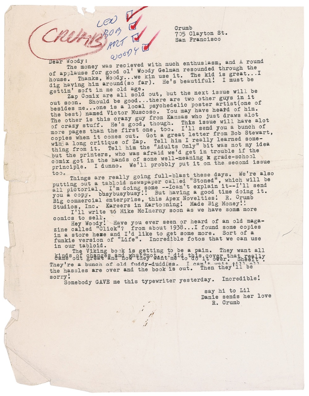 Iconic American cartoonist (born 1943) who created the classic underground “comix” Zap and Snatch, featuring the overtly sexual escapades of Mr. Natural, the grotesquely voluptuous Angelfood McSpade, and many others. Unsigned typed letter, one page, 8.5 x 11, no date. Letter written to Woody Gelman, reads in part: “Zap Comix are all sold out, but the next issue will be out soon…Should be good…there are two other guys in it besides me…one is a local psychedelic poster artist…got a great letter from Bob Stewart, with a long critique of Zap. Tell him I really learned something from it. Tell him the ‘Adults Only’ bit was not my idea but the printers, who was afraid we’d get in trouble if the comix got in the hands of some well-meaning grade-school principle [sic]…Somebody gave me this typewriter yesterday. Incredible!” Also present is the original mailing envelope, addressed in Crumb’s hand to Gelman in New York, and signed in the top left as part of the return address, “Crumb,” with a clipped picture of an old movie projector affixed to left edge, with Crumb adding several rows of diagonal lines coming from the projector. In very good condition, with several tears to left edge, folds, neither of which affect legibility, scattered creases and toning, and a rusty paperclip mark. Envelope has several vertical creases, paper loss to back and a staple hole. Pre-certified PSA/DNA and RRAuction COA.