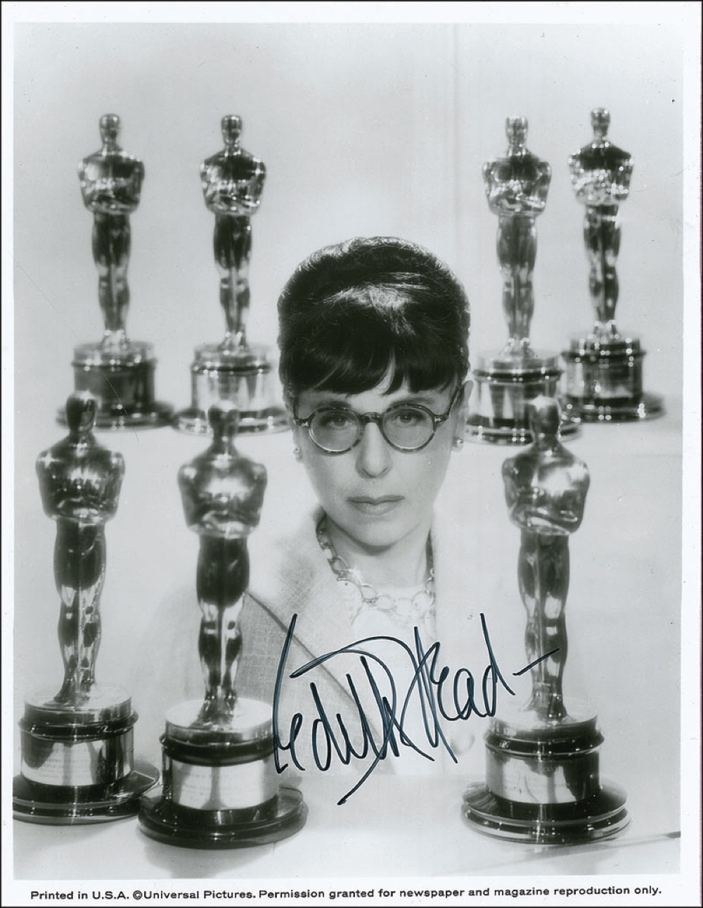 Glossy 8 x 10 Universal publicity photo of Head surrounded by her seven Academy Awards, signed in black felt tip. Scattered light surface impressions and bends, otherwise fine condition. Pre-certified PSA/DNA and RRAuction COA.
