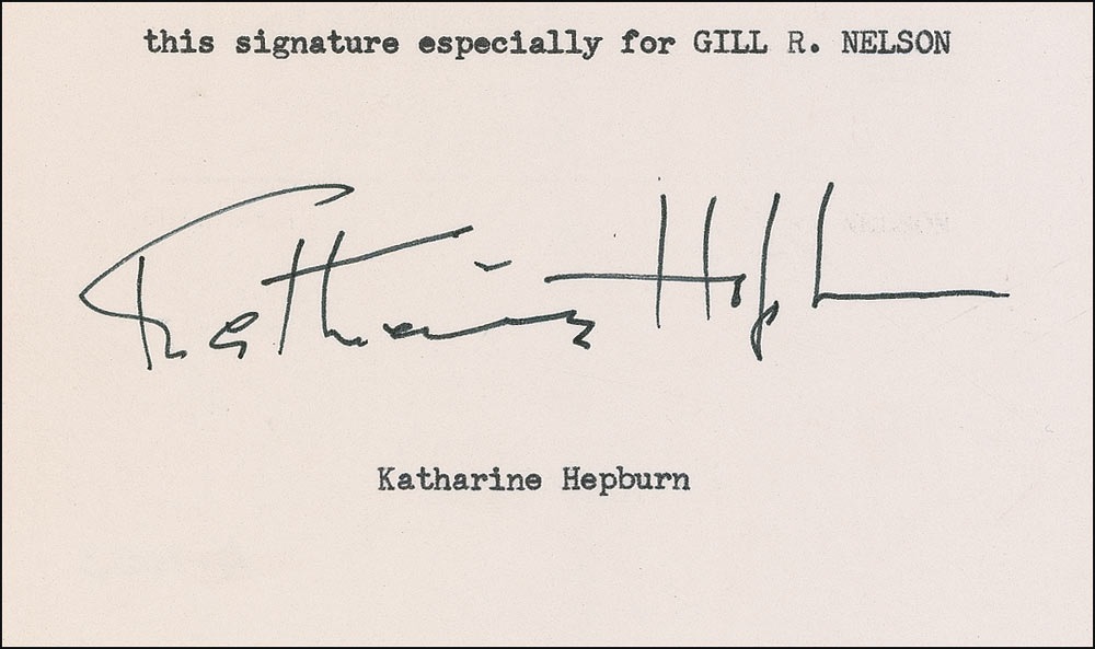 Felt tip signature, “Katharine Hepburn,” on an off-white 5 x 3 card, with a typed collector’s inscription and notation added at top of card. In very fine condition. Accompanied by an unsigned 1974 People magazine cover featuring Hepburn posing with John Wayne. Pre-certified PSA/DNA and RRAuction COA.