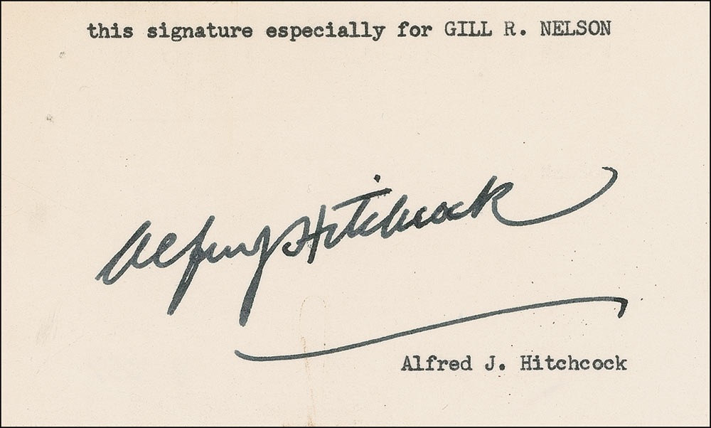 Felt tip signature, “Alfred Hitchcock,” on an off-white 5 x 3 card with a typed collector’s notation and inscription added along the top. In fine condition, with staple hole to top left and a bit of light soiling to bottom. Pre-certified PSA/DNA and RRAuction COA.