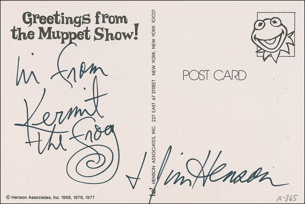Color 4 x 6 Muppet Show postcard photo, signed on the reverse in black felt tip, “Hi from Kermit the Frog & Jim Henson.” In fine condition. Pre-certified PSA/DNA and RRAuction COA.
