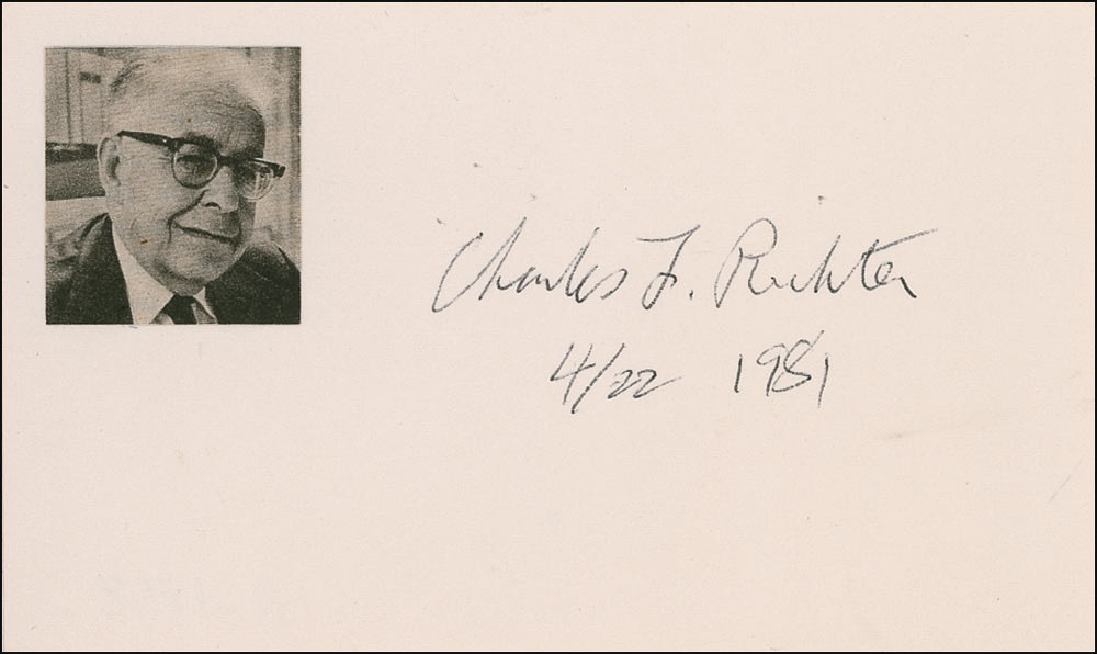 Seismologist, most famous as the creator of the Richter Magnitude Scale which quantifies the size of earthquakes. Ballpoint signature, “Charles F. Richter 4/22 1981,” on an off-white 5 x 3 card, with a small clipped photo affixed to top left corner. In fine condition. RRAuction COA.