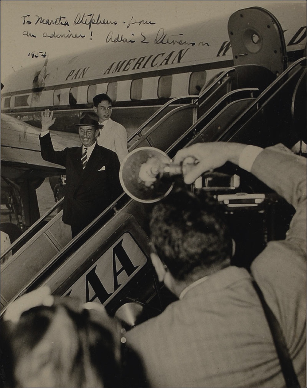 Vintage matte-finish 8 x 10 photo of Stevenson waving as he descends from an airplane, signed and inscribed in fountain pen “To Martha Stephens–from an admirer. Adlai E. Stevenson 1954.” Matted and framed to an overall size of 13 x 15. In very good condition, with some stray light ink stains under signature and overall light silvering. RRAuction COA.