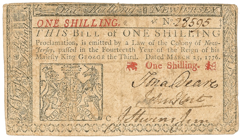 Signer of the Declaration of Independence from New Jersey (1713–1779). Engraved one shilling New Jersey note, printed by Isaac Collins of Burlington, 3.75 x 2, dated March 25, 1776, signed in ink by Hart and two others. Reverse bears a tobacco leaf and bears a strong deterrent on the reverse side: “To counterfeit is Death.” Moderate toning and soiling, Hart’s signature light, but legible, central vertical fold, and scattered light creasing, otherwise very good condition. Pre-certified John Reznikoff/PSA/DNA and RRAuction COA.