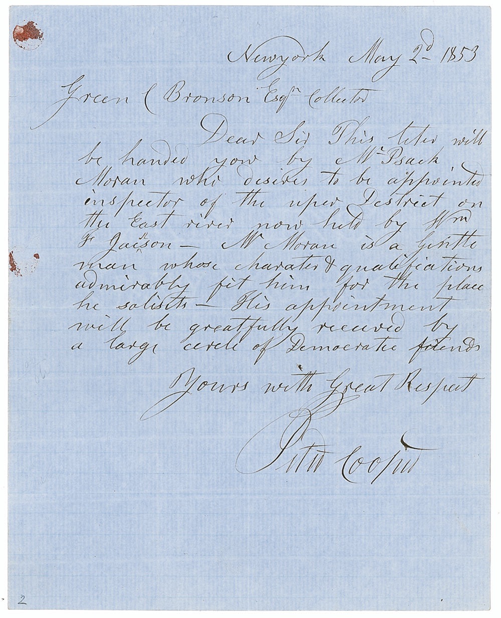 Versatile American industrialist, inventor, and politician (1791–1883) who designed the first steam locomotive built in the United States, the Tom Thumb, and patented a gelatin dessert later marketed under the familiar brand name Jell-O. ALS, one page, 7.75 x 9.75, May 2, 1853. Cooper writes to Green C. Bronson. In full: “This letter will be handed you by Mr. Isack Moran who desires to be appointed inspector of the uper [sic] District on the East river now held by Wm. F. Jackson—Mr. Moran is a gentle man whose character & qualifications admirably fit him for the place he solicits—His appointment will be greatfully [sic] received by a large circle of Democratic friends.” In very good condition, with several intersecting folds, one vertical line passing through the start of his name, a small area of paper loss, and a few spots of wax remnants. Accompanied by a vintage color caricature from Puck magazine. RRAuction COA.