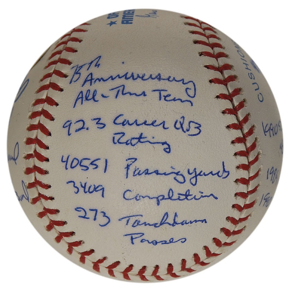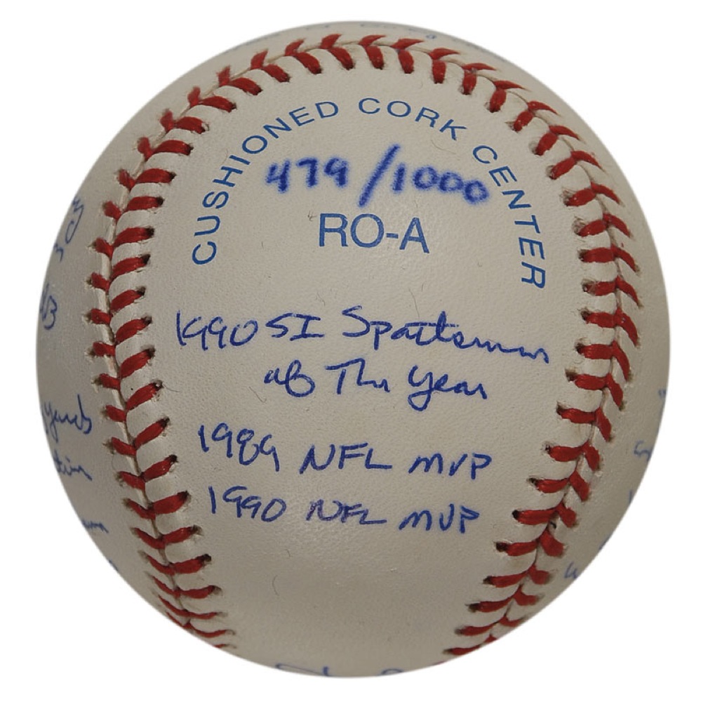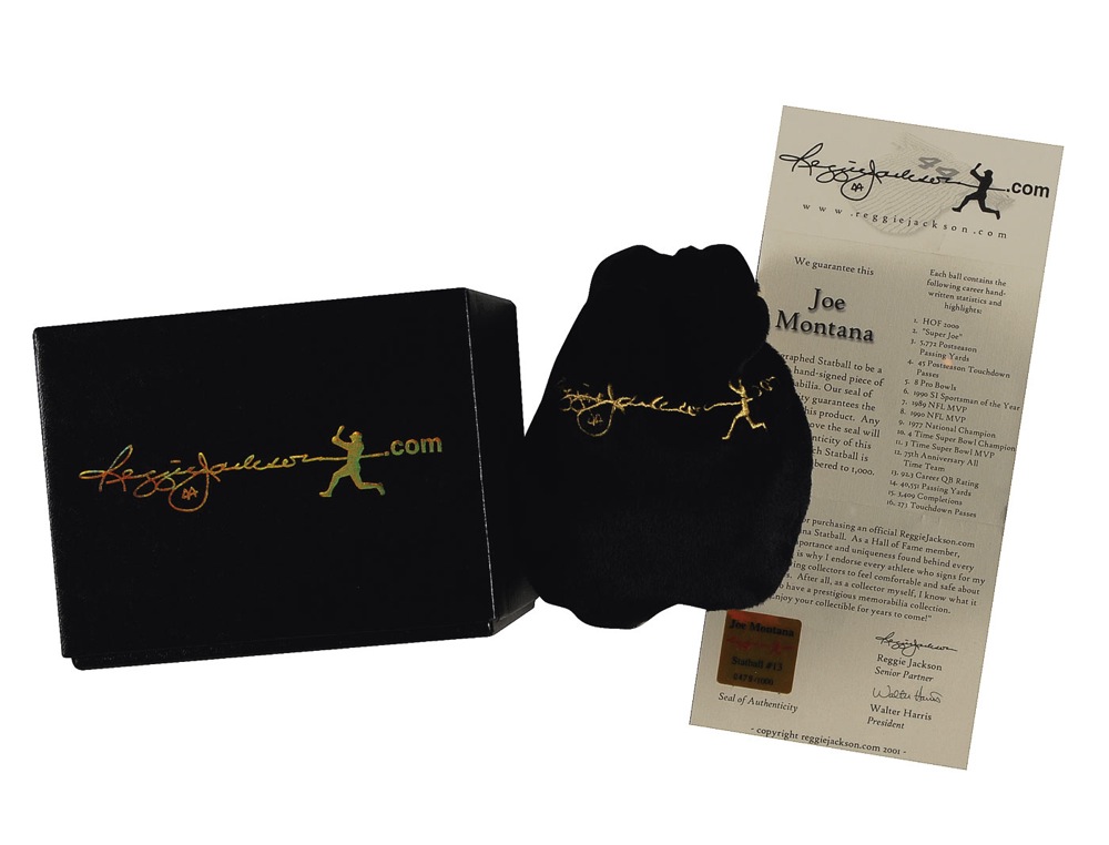 Official limited edition Rawlings American League baseball, #479/1000, signed in blue ballpoint on the sweet spot, “Joe Montana HOF 2000,” with Montana adding 15 of his career statistics. In fine condition, with a bit of scattered light spreading of ink to some of the statistical information. Accompanied by a Reggiejackson.com certificate of authenticity, as well as its original cloth bag and box. Pre-certified Steve Grad/PSA/DNA and RRAuction COA.