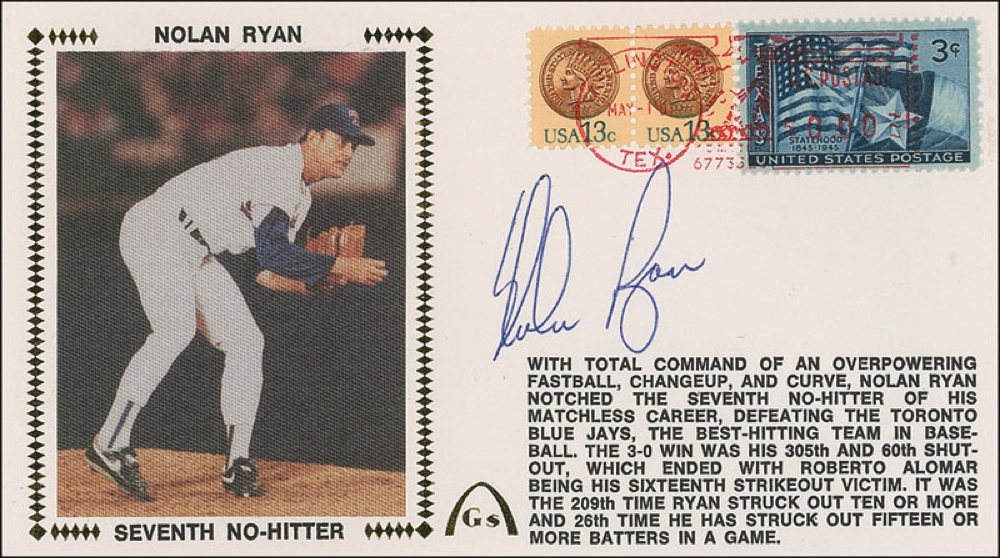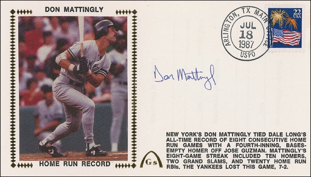 Three Gateway commemorative covers, with color cachets honoring Ryan, Mattingly, and McGwire, respectively, signed in blue ballpoint by Ryan and Mattingly and in black ballpoint by McGwire on their respective covesr. In overall fine condition. RRAuction COA.