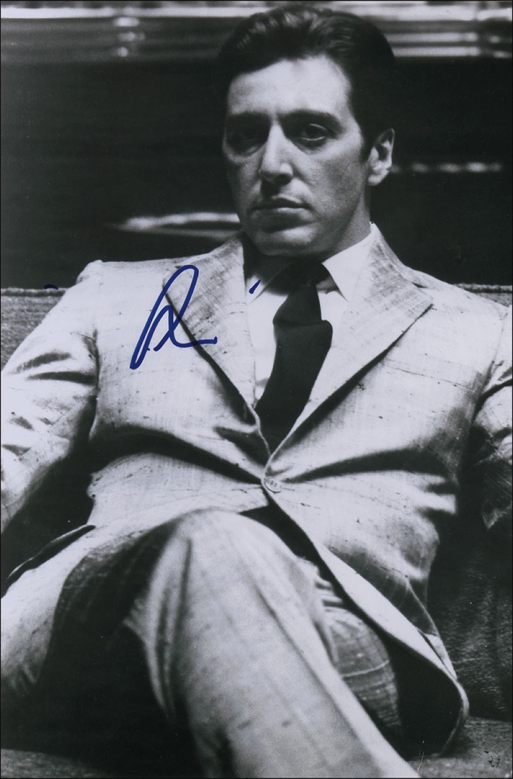 Satin-finish 8 x 12 photo of Pacino as Michael Corleone, signed in-person in blue felt tip. A couple trivial dings to top edge, otherwise very fine condition. Pre-certified PSA/DNA and RRAuction COA.