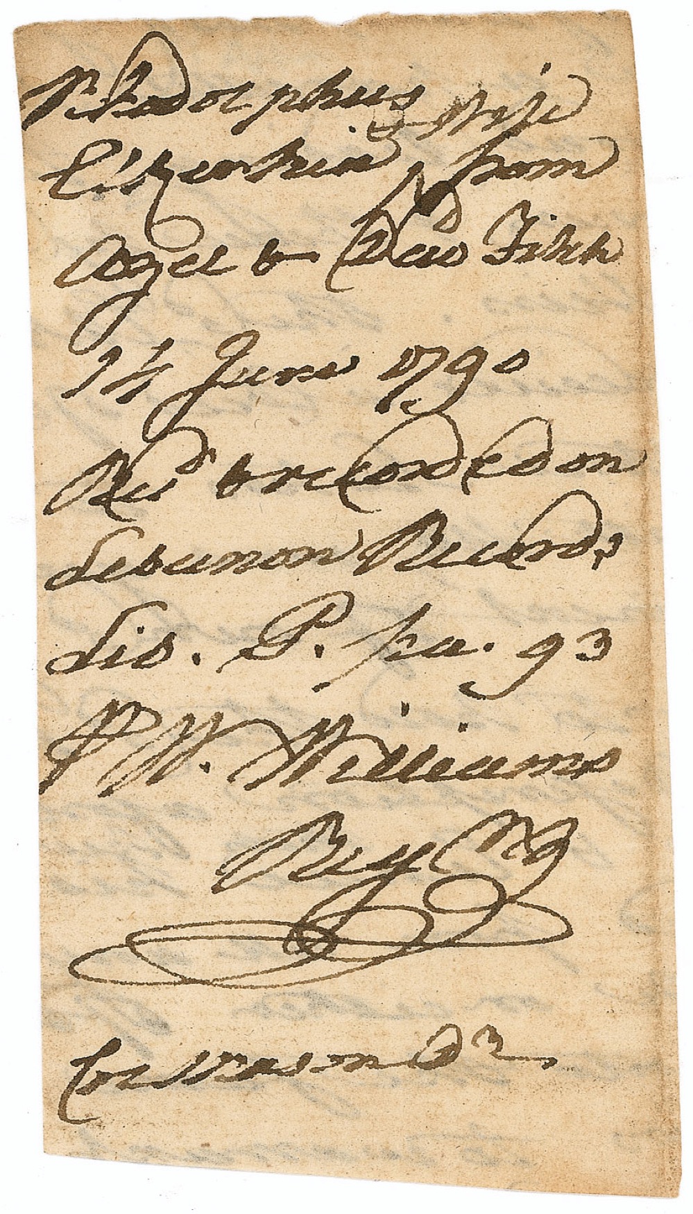 Signer of the Declaration of Independence from Connecticut (1731–1811). Endorsement, “W. Williams,” on a 2 x 3.75 slip clipped from a larger document and incorporating a couple dozen words in his diffcult-to-decipher hand, 1790. Light overall soiling, show-through from writing on the reverse, and somewhat irregular edges, otherwise fine condition. Pre-certified John Reznikoff/PSA/DNA and RRAuction COA.