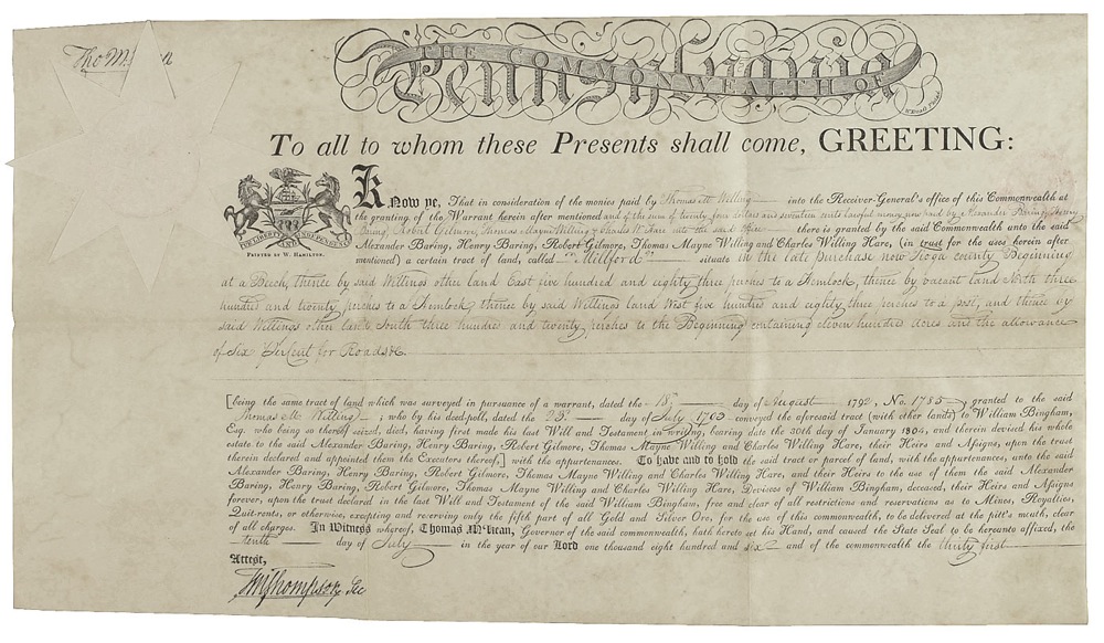 Signer of the Declaration of Independence from Delaware (1734–1817) who later served as a Revolutionary War officer, delegate to the Continental Congress, and Governor of Pennsylvania. Vellum DS, signed “Tho. M:Kean,” one page, 21 x 11.75, July 10, 1806. A grant for a tract of land called “Millford” issued to a trust. Signed in the upper left corner by McKean. In fine condition, with heavy intersecting folds, and some mild wrinkling and toning. The embossed paper seal is crisp and intact. Pre-certified John Reznikoff/PSA/DNA and RRAuction COA.