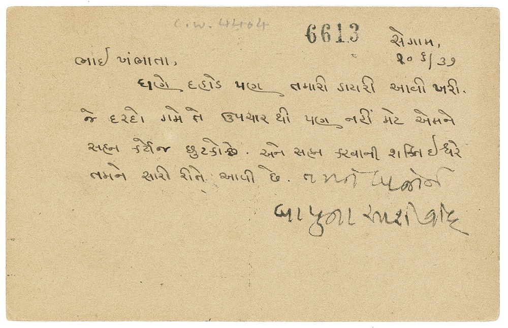 LS in Gujurati, signed “Bapu’s blessings to you both,” one page, 5.5 x 3.5, June 20, 1937. Letter to his friend Dr. Behram Navroji Khambatta. In full (translated): “I finally got your diary, though quite late. If an ailment does not get better, after various treatment, the only alternative is to put up with it. God has given you sufficient strength to bear it.” In fine condition, with a uniform shade of light toning, and a couple small stamps and notations. Pre-certified John Reznikoff/PSA/DNA and RRAuction COA.
