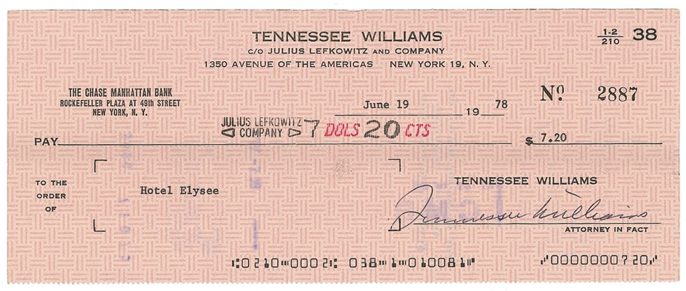 Personal check, 8.5 x 3.5, filled out in type and signed by Williams, payable to Julius Lefkowitz Company for $7.20, June 19, 1978. In fine condition, with a vertical fold to left side, and light show-through from stamps on reverse, one showing-through under first name of signature. RRAuction COA.