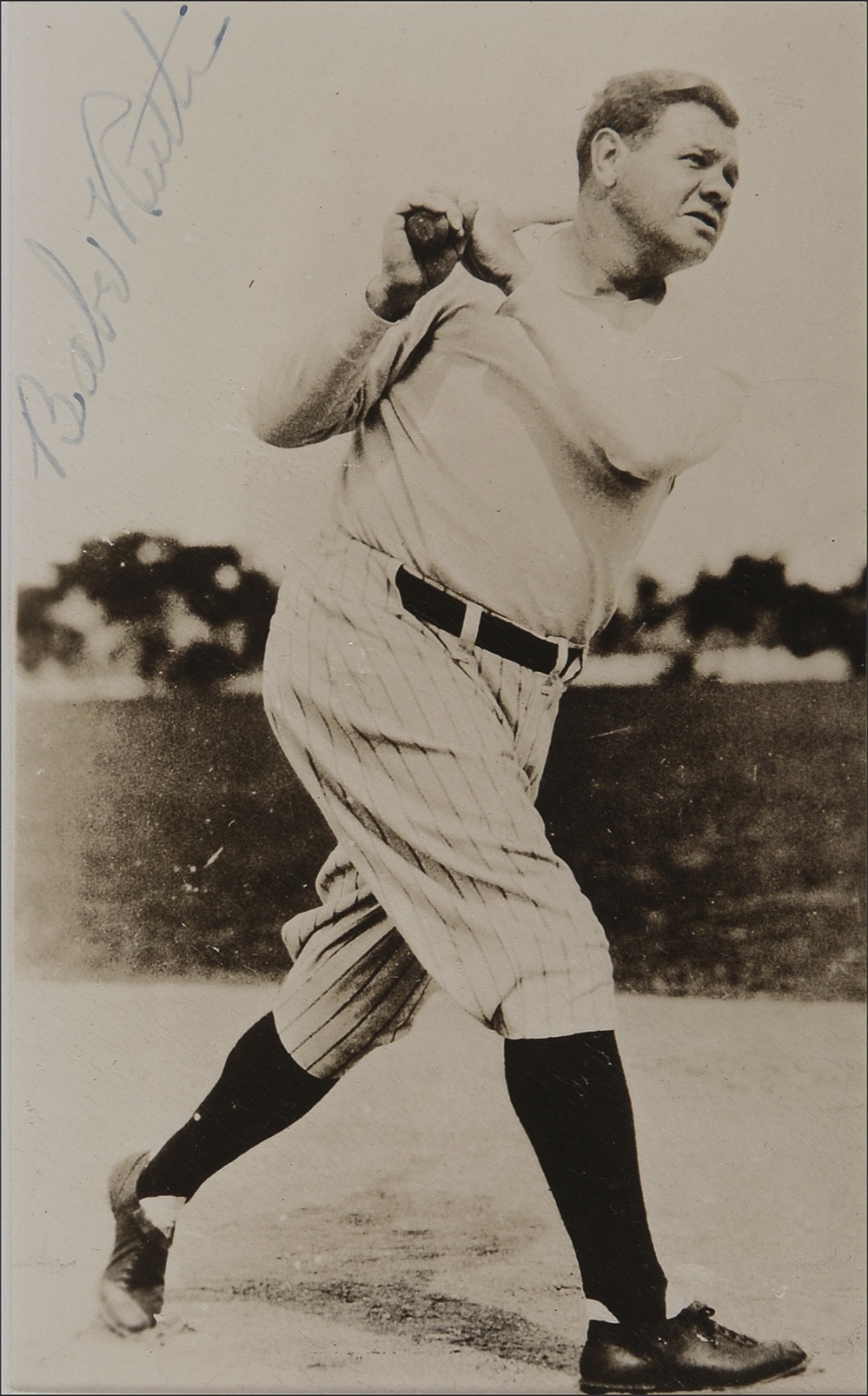 Vintage glossy 3 x 5 photo of Ruth taking a monster practice swing, signed in fountain pen. Double matted and framed to an overall size of 10 x 11.75. In very good condition, with light overall crazing to finish, a few scattered creases and surface marks, and Ruth’s signature a shade light, but completely legible. Pre-certified Steve Grad/PSA/DNA and RRAuction COA.