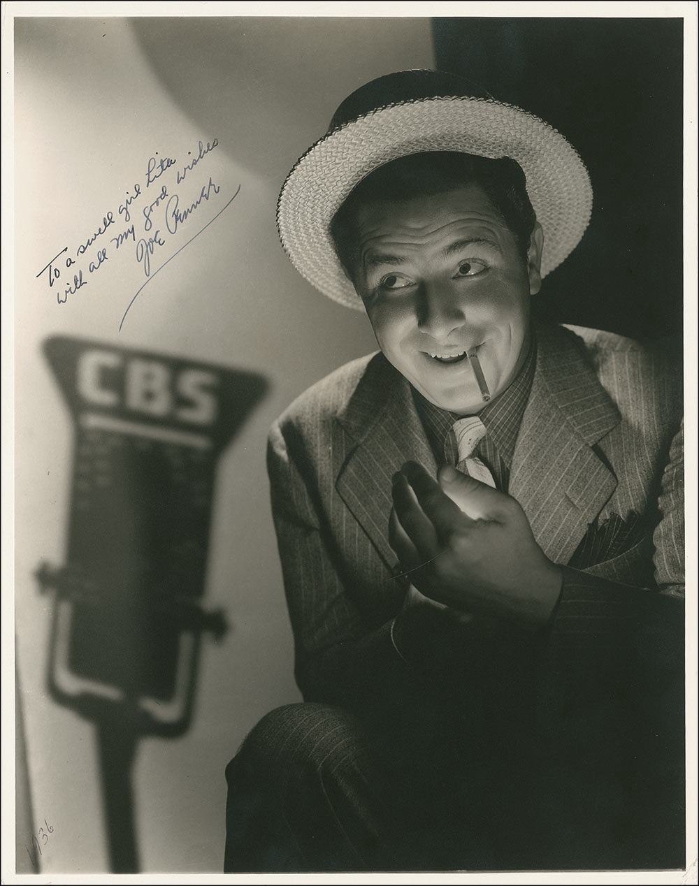 Vintage matte-finish 11 x 14 photo of Penner lighting a cigarette in front of a CBS microphone, signed and inscribed in fountain pen “To a swell girl Lita, with all my good wishes, Joe Penner.” In fine condition, with light corner tip creasing, a bit of scattered light silvering to darker areas, and a date notation of 1936 in another hand to lower left corner of photo. Pre-certified PSA/DNA and RRAuction COA.