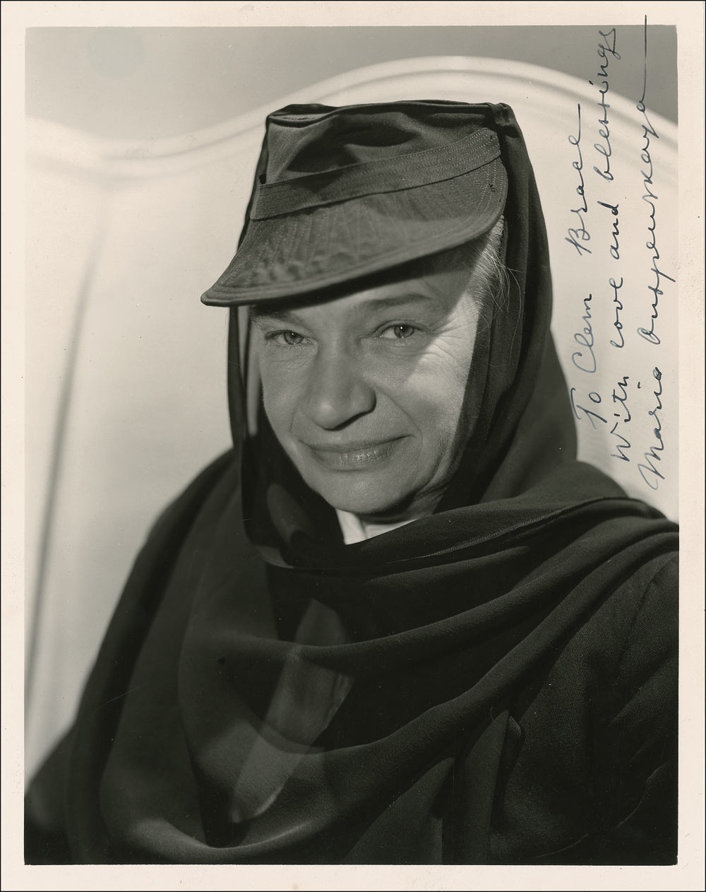 Oscar-nominated, Russian-born actress (1887–1949) best remembered for her portrayal of Maleva, the old fortune teller in the 1941 horror classic, The Wolf Man. Ouspenskaya died from a stroke several days after receiving severe burns in a house fire, which she had caused by falling asleep while smoking a cigarette. Striking vintage glossy 8 x 10 photo, signed and inscribed in fountain pen “To Clem Brace, with love and blessings, Maria Ouspenskaya.” In fine condition, with a few trivial surface marks. Pre-certified PSA/DNA and RRAuction COA.