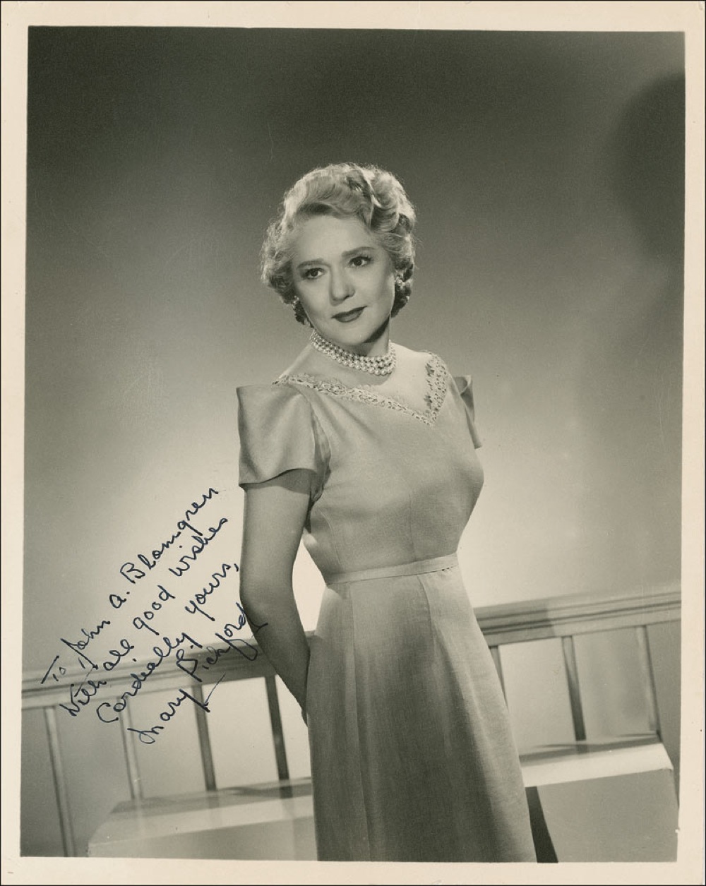 Vintage matte-finish 8 x 10 photo of the middle-aged actress, signed and inscribed in fountain pen “To John A. Blomgren, With all good wishes, Cordially yours, Mary Pickford.” In very good condition, with scattered light edge dings and creases, and a few mild creases to background. Pre-certified PSA/DNA and RRAuction COA.