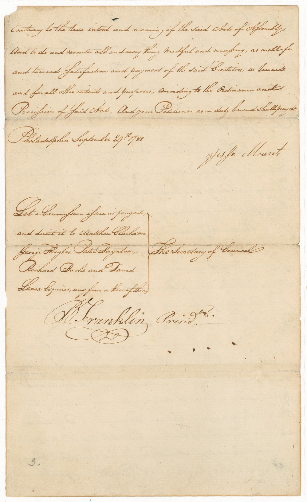Manuscript DS, beautifully signed “B. Franklin, Presidt,” one page both sides, 7.75 x 13, September 29, 1788. Document headed “To his Excellency Benjamin Franklin Esquire President of the Supreme Executive Council of the Commonwealth of Pennsylvania –The Petition of Jesse Mount, Creditor of Daniel Danser of the County of Philadelphia (late of Gloucester County in the State of New Jersey) Dealer and Chapman.” Document continues, “That whereas Daniel Danser using and exercising the Trade and business of a Dealer and Chapman by way of Bargaining, Exchange, Rechange, and Bartry and seeking his Trade of Living by Buying and Selling for just and good causes being indebted unto your Petitioner in the sum of Two hundred pounds and upwards…did become a Bankrupt within the meaining of the Acts of Assembly of this Commonwealth.” Signed at the conclusion by Mount, and signed by Franklin forwarding this petition to the Secretary of Council which orders “Let a Commission issue as prayed and direct it to Matthew Clarkson, George Hughes, Peter Boynton, Richard Bache [Franklin’s son-in-law] and David Lenox Esquires, any four or three of them.” Archivally sleeved in acid-free Mylar. Well done professional reinforcement to all three horizontal folds, a uniform shade of mild toning and some light soiling, a bit heavier along top edge, and light show-through from writing on opposing sides, otherwise fine condition.