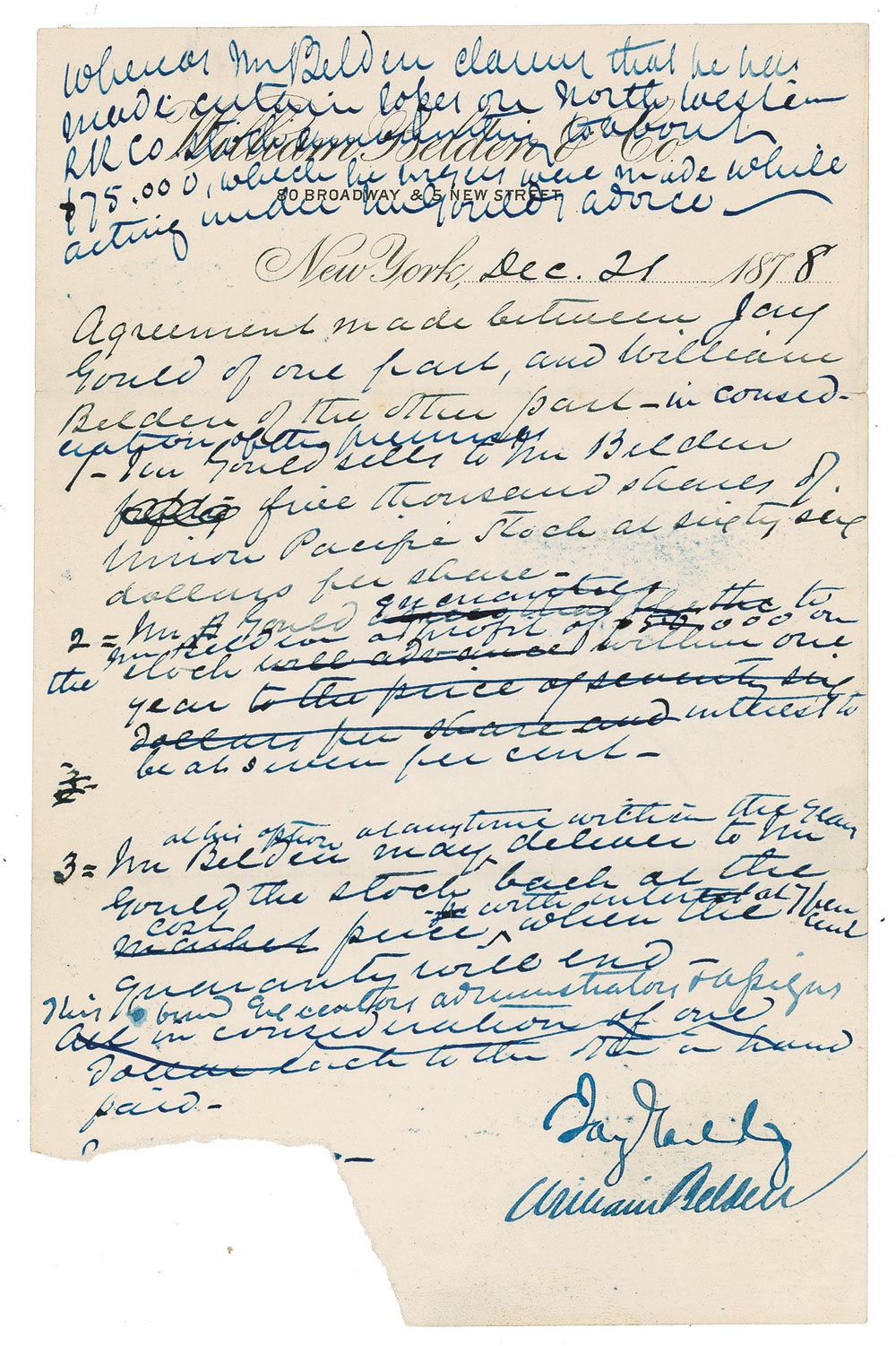 A second unsigned manuscript document, one lightly-lined page both sides, 8 x 12.5, dated December 21, 1878, being a final version of the above draft document, with interesting changes to the original draft. In part: “Whereas William Belden claims that he has made certain losses on Northwestern Railroad stock amounting to about seventy five thousand dollars, which he urges were made while acting under Mr Goulds advice; Now this agreement made between Jay Gould of the one part and William Belden of the other part, in consideration of the premises aforesaid, is as follows: First: Mr. ['Bel' crossed out] Gould sells to Mr. Belden, and Mr. Belden buys of Mr. Gould, five thousand shares of the Union Pacific stock at sixty-six dollars a share. Second: Mr Gould guarantees to Mr. Belden such an advance in the price of the stock within one year from this date as will enable Mr. Belden - to make a profit of fifty thousand dollars on said stock within one year from this date, interest on the cost of the stock to be at the rate of seven per cent in arriving at the profit.”