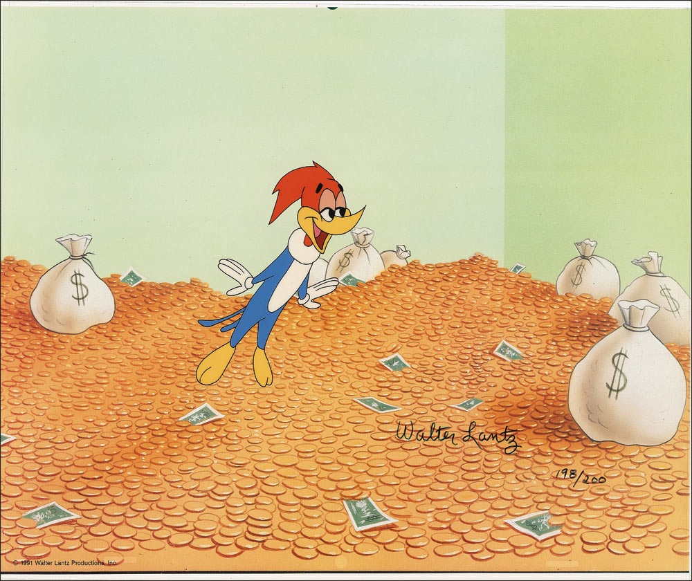 Limited edition hand-painted animation cel entitled ‘Moneybags Woody,’ 12 .5 x 10, #198/200, showing Woody Woodpecker in a roomful of money, signed in black felt tip by Lantz, and set against a pre-printed color background. In fine condition. RRAuction COA.