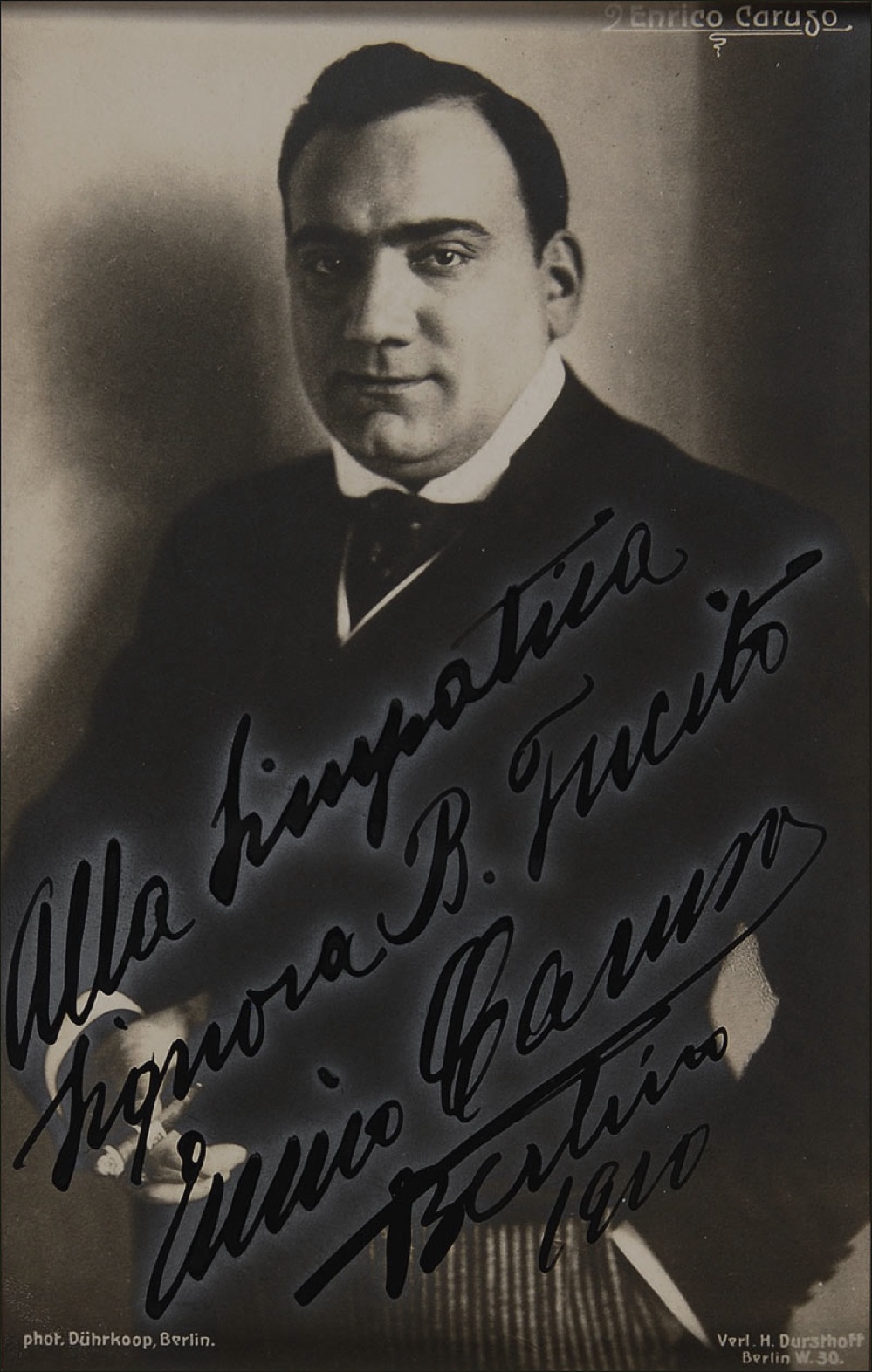 Vintage 3.25 x 5 German postcard photo of Caruso in a waistcoat and holding a cigar. Signed and inscribed in fountain pen in Italian to Signora B. Fucito, “Enrico Caruso, Berlin 1910.” Suede matted and framed to an overall size of 8 x 10. In very good condition, with moderate overall silver haloing around the signature and inscription. Pre-certified PSA/DNA and RRAuction COA.