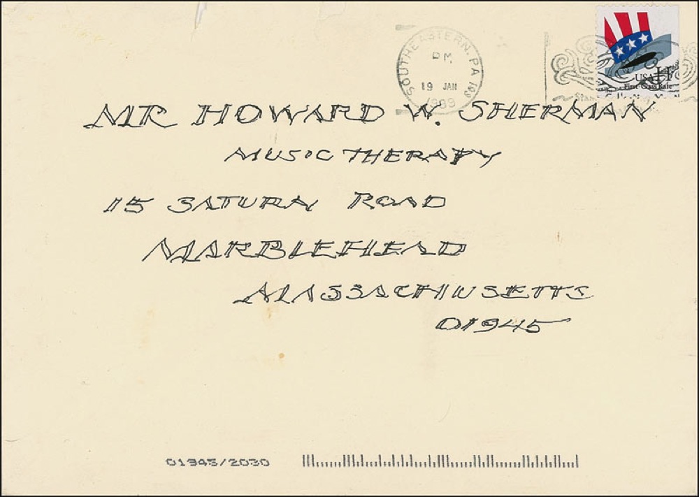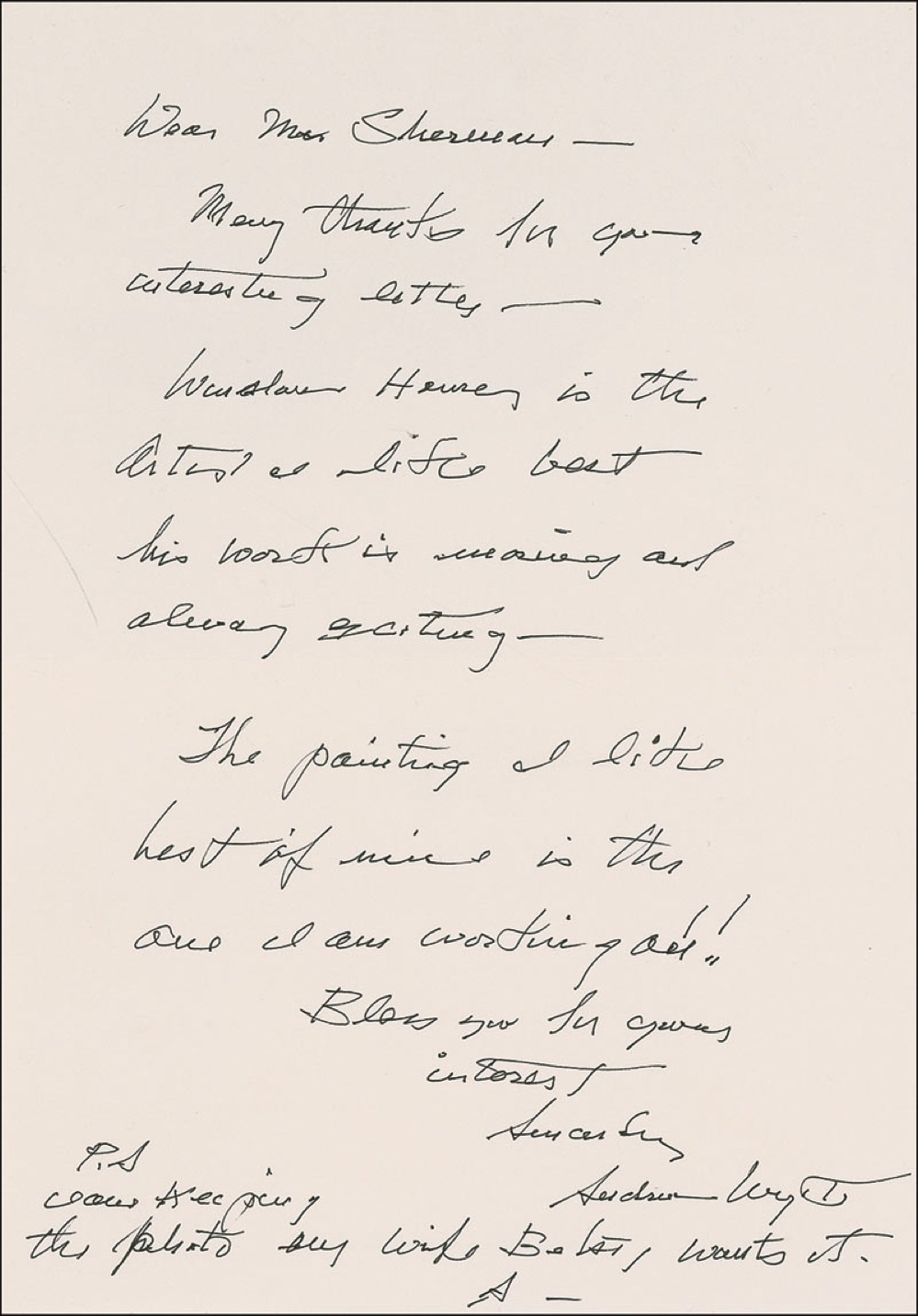 ALS written on the inside of a 7 x 5 greeting card bearing one of his works. In full: “Many thanks for your interesting letter—Winslow Homer is the artist I like best. His work is moving and always exciting—The painting I like best of mine is the one I am working on! Bless you for your interest.” He has added the postscript: “I am keeping the photo, my wife Betsy wants it. A—” According to the consignor, he sent Wyeth a photo asking him to sign it, but as noted, the artist’s wife opted to keep it for herself. In fine condition. Accompanied by the original mailing envelope, postmarked January 19, 1999, and addressed by Wyeth in an artistically elaborate fashion. Pre-certified PSA/DNA and RRAuction COA.