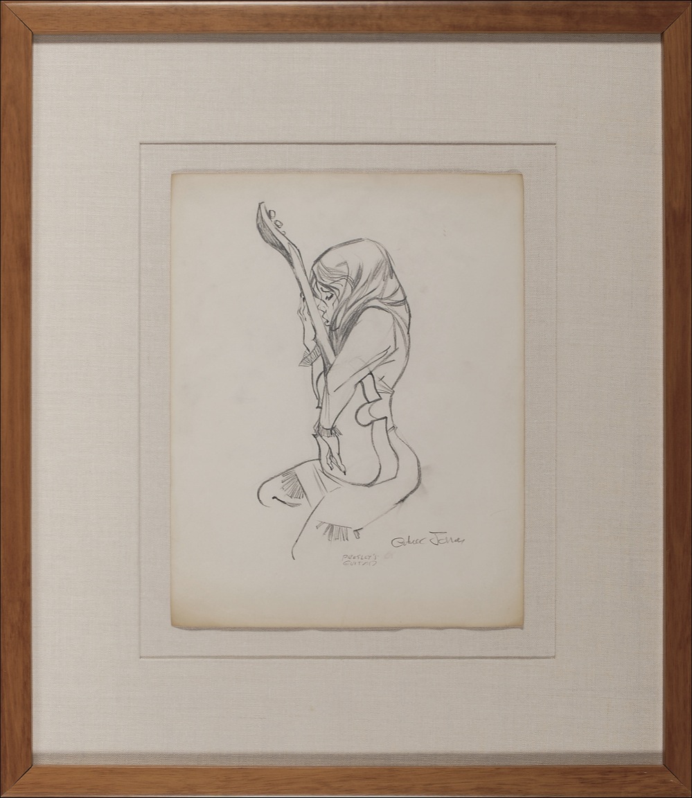Original signed pencil sketch of a girl cradling a guitar on a white 10.75 x 14.25 sheet. Jones has written “Presley’s Guitar” adjacent to his signature. Cloth matted and framed to an overall size of 21.75 x 25.25. In fine condition, with scattered creasing, handling wear, and mild edge toning. Accompanied by a letter of authenticity from the Chuck Jones Showroom. A decidedly un-Bugs Bunny-like original drawing. Oversized. Pre-certified PSA/DNA and RRAuction COA.