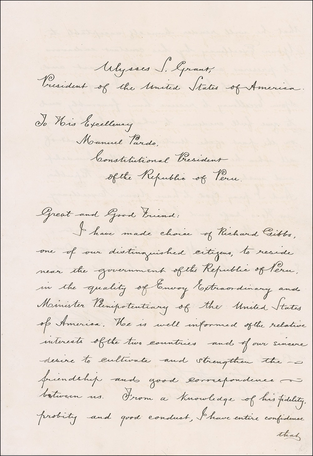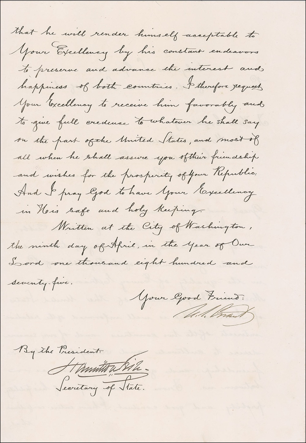Unusual DS as president, one page both sides, 10.5 x 15.5, April 9, 1875. An official letter of state to the Constitutional President of the Government of Peru announcing the appointment of “Richard Gibbs, one of our distinguished citizens, to reside near the government of the Republic of Peru in the quality of as Envoy Extraordinary and Minister Plenipotentiary of the United States of America.” Signed at the conclusion by Grant, and countersigned by Secretary of State Hamilton Fish. In fine condition, with central horizontal and vertical fold and a bit of scattered light toning. A fine, bright example signed on the tenth anniversary of perhaps the most triumphant day of Grant’s career. Pre-certified John Reznikoff/PSA/DNA and RRAuction COA.