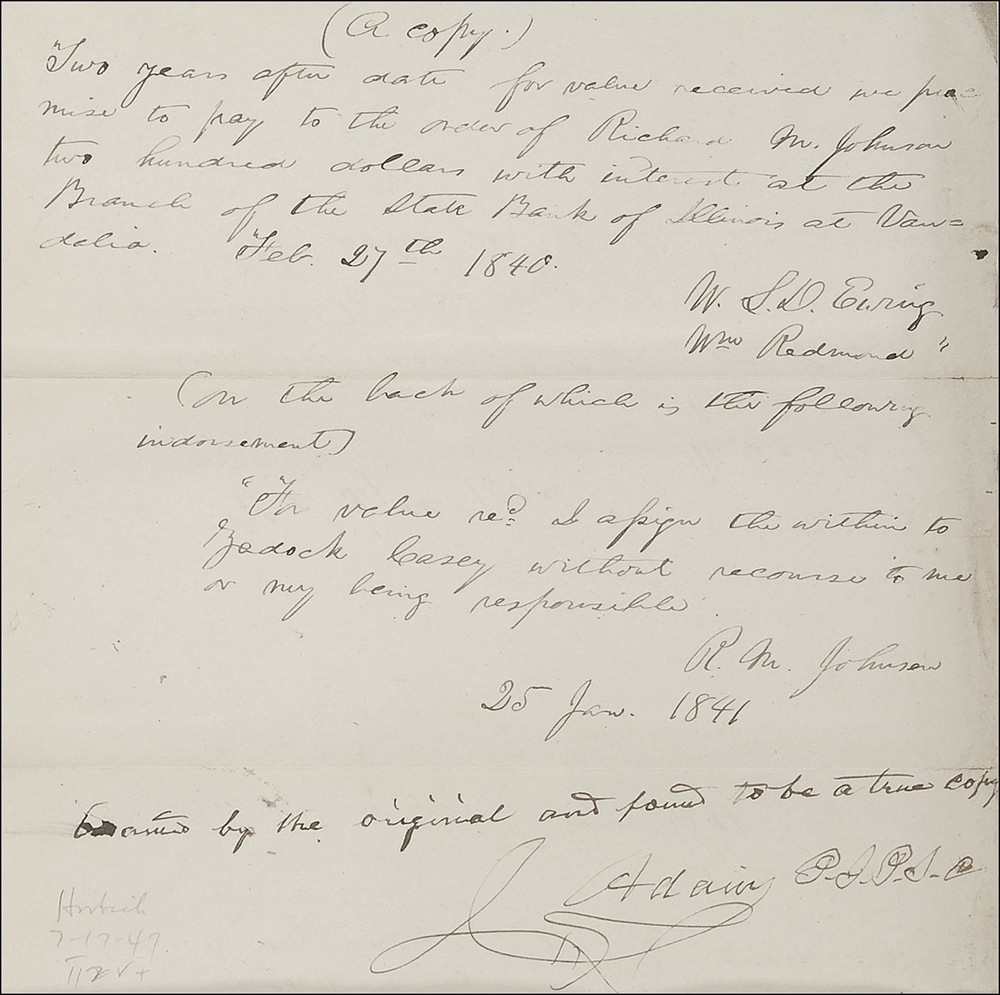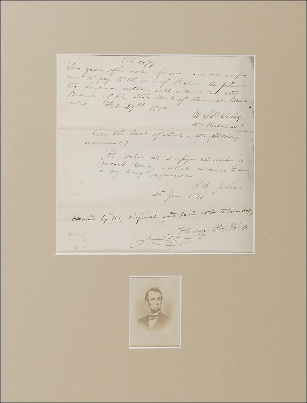 Autograph document, one page, 8.5 x 8.5, no date. Once part of a larger document, labeled “A Copy,” in Lincoln’s hand, of a February 1840 promissory note for $200 which was to have been paid “with interest at the branch of the State Bank of Illinois at Vandalia.” Document continues “’For value recd I assign the within to Zadcock Casey without recourse to me or my being responsible.” Matted with a CDV portrait of Lincoln, to an overall size of 13.5 x 17.5. In very good condition, with two horizontal folds, scattered toning, soiling, and creasing, a few small edge tears, and some light pencil notations to lower left. Accompanied by a typescript on Lincoln Library, Shippensburg, Pennsylvania, letterhead. Over sixty-five words in Lincoln’s hand. Pre-certified John Reznikoff/PSA/DNA and RRAuction COA.