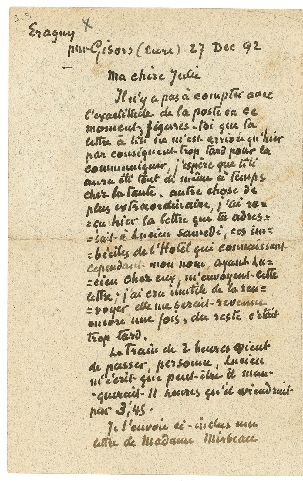 I enclose herewith a letter from Mrs. Mirbeau that must be answered. Peissier writes to me that the notary in Chaumont agrees to smaller fees and will have Edoline sign a promise to receive the six thousand francs in three months or perhaps in one month. That will mean another fee to pay but it will not be much. What do you think of the letter that Georges wrote about Lucien. I thought it was not very nice of him. In fact I told him that it was not the right moment to make fun of Lucien when he is the one who was wrong when he sent a postcard to Titi to this address – Mr. Felix c/o Lucien Pissarro!
