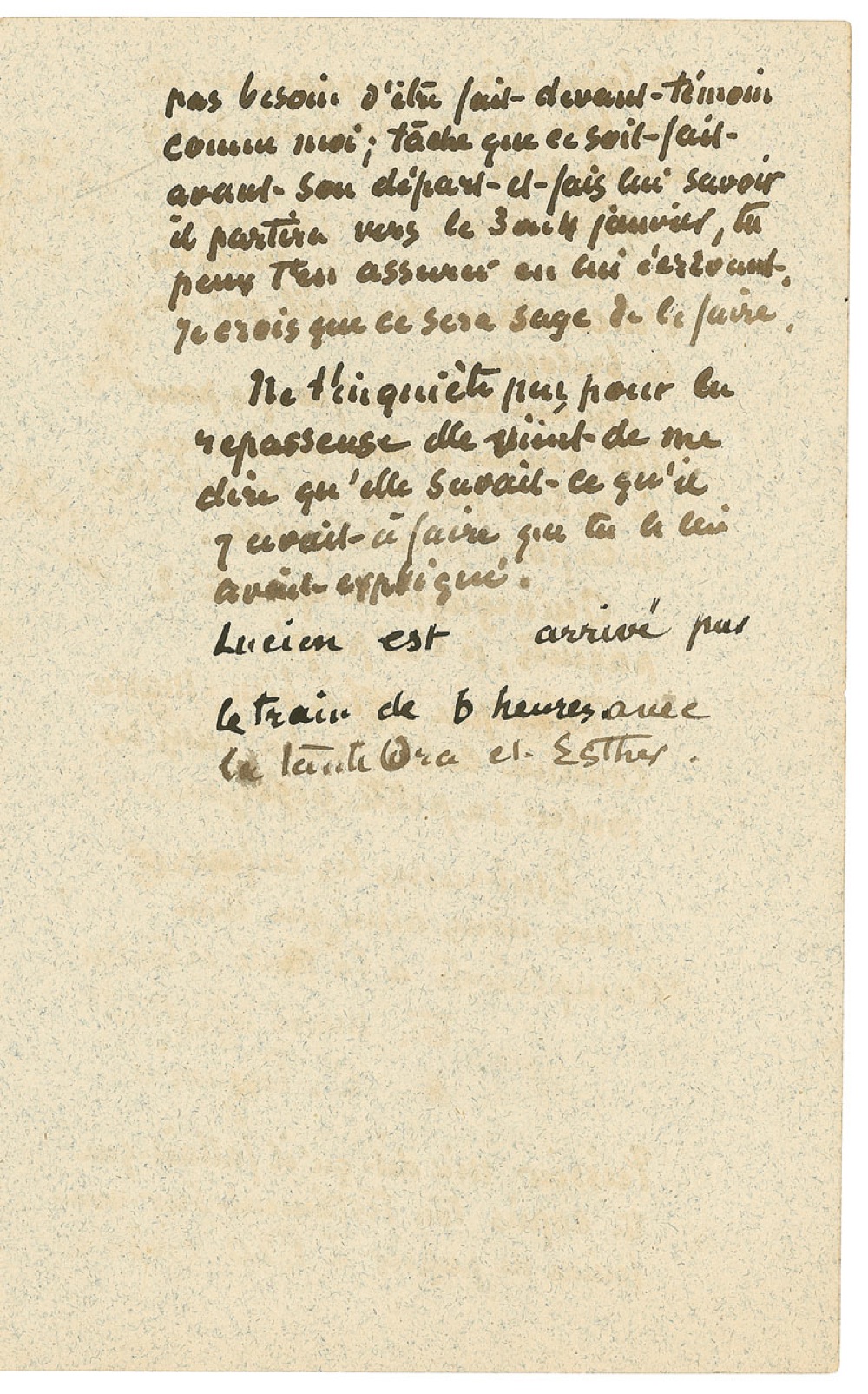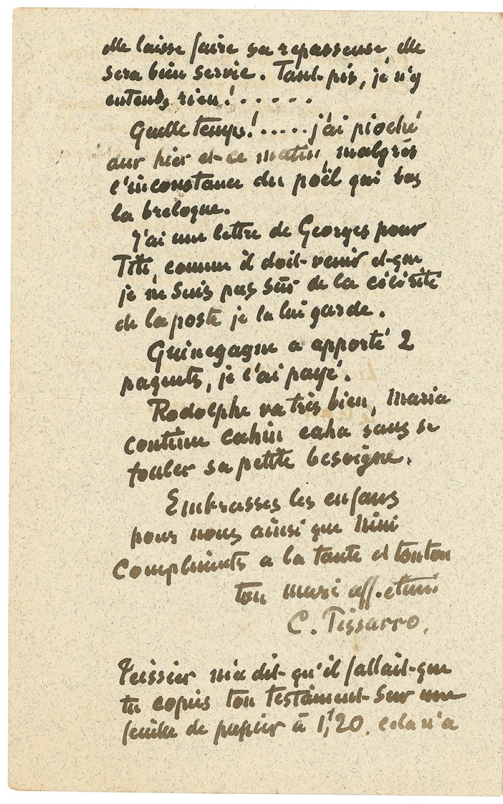 After his signature, Pissarro writes: “Peissier told me that you must copy your will on a 1F20 sheet of paper. It does not have to be done in the presence of a witness, as with me; try to have it done before he leaves and let him know, he will leave around the 3 or 4 of January, you could find out by writing to him. I think it would be a wise thing to do. Don’t worry about the ironing woman, she just told me that she knows what to do, that you explained to her. Lucien arrived on the 6 p.m. train with Aunt Ora and Esther.”