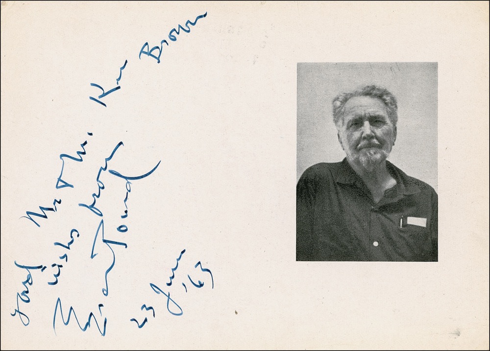 Scarce 6 x 4.25 cardstock photo (image area 1.75 x 2.5), signed and inscribed in the wide left margin in blue fountain pen, “Mr & Mrs Ken Brown, good wishes from Ezra Pound, 23 June ’63.” Bends to corner tips and some scattered light creasing, otherwise fine condition. Accompanied by a brief handwritten transmittal letter from his wife Dorothy and the original mailing envelope addressed in Dorothy Pound’s hand. Provenance: The Barry Hoffman Collection. Pre-certified PSA/DNA and RRAuction COA.