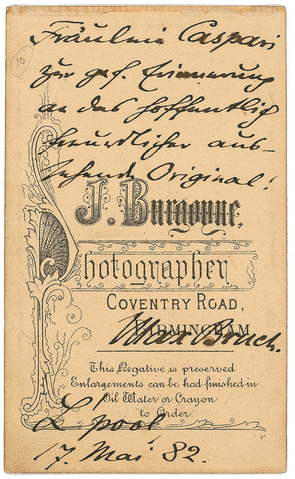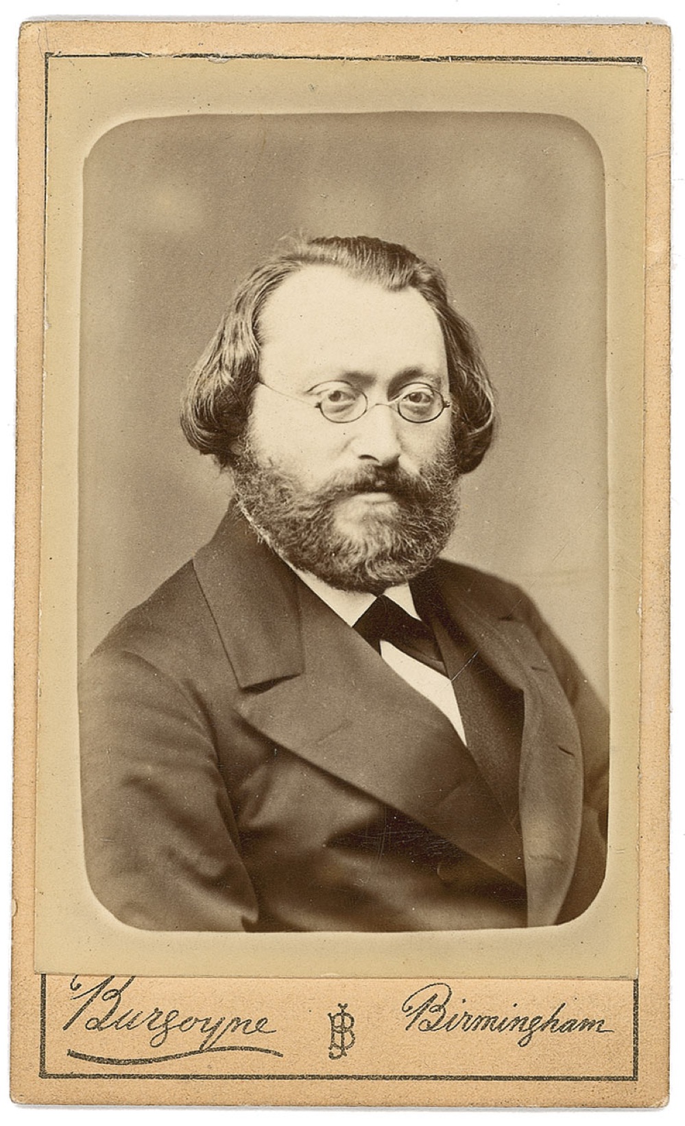 German composer (1838-1920) who wrote over 200 works, one of which is a staple of the violin repertoire. Serious-looking 2.5 x 4 carte-de-visite portrait by J. Burgoyne of Birmingham, England, signed and inscribed ink over the photographer’s information on the reverse, he adds “L’pool, 17 Mai ’82.” Light scratching to the very clear image, otherwise fine condition. Provenance: The Barry Hoffman Collection. RRAuction COA.