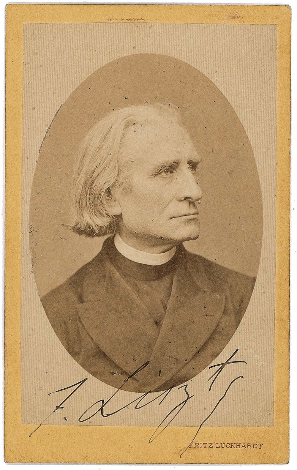 Hungarian Romantic era composer and pianist (1811–1886) whose prowess at the keyboard earned him a cachet as perhaps the greatest virtuoso in the history of the instrument. Distinguished 2.5 x 4 carte-de-visite by Fritz Luckhardt, nicely signed “F. Liszt” in ink below the image. Light scuffs to the image and various notations and stamps on the reverse, otherwise fine condition. An exceptional pose. Provenance: The Barry Hoffman Collection. Pre-certified John Reznikoff/PSA/DNA and RRAuction COA.