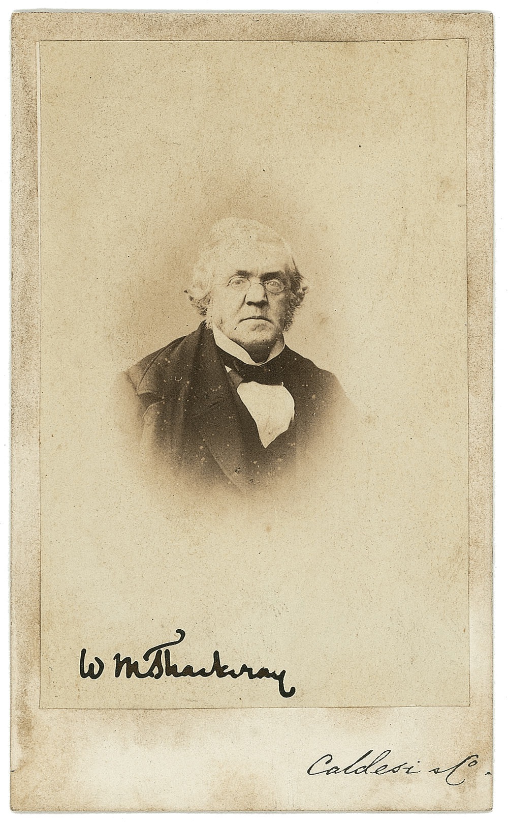 Well-regarded British novelist (1811–1863) of such satirical classics as Vanity Fair. Vintage 2.5 x 4 carte-de-visite photo by L. Caldesi & Co. of London (and so stamped on the reverse), boldly signed in black ink, “W. M. Thackeray.” Scattered light toning to image and borders, and light mounting remnants to reverse, otherwise fine condition. Provenance: The Barry Hoffman Collection. RRAuction COA.