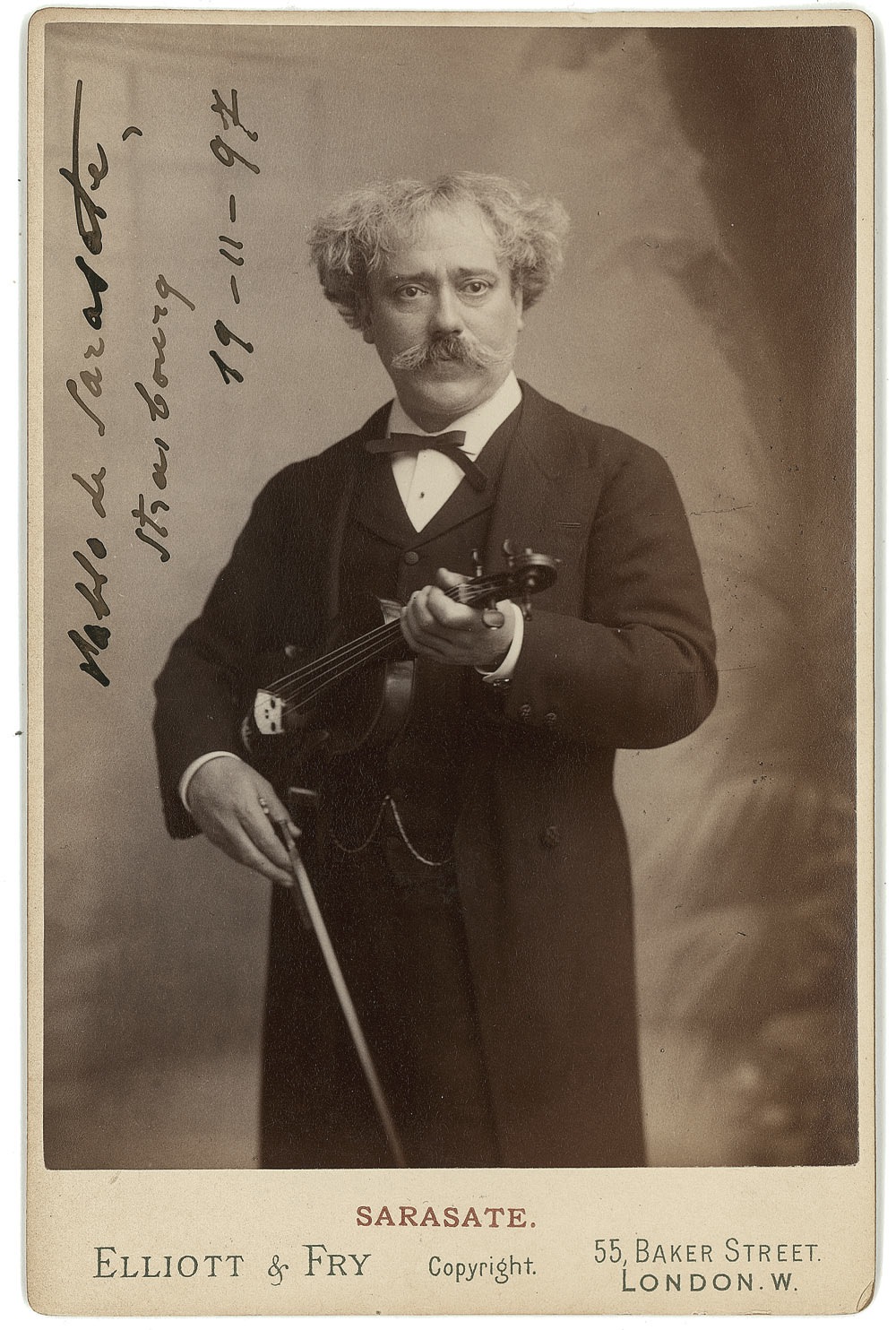 Spanish violinist and composer (1844-1908). Choice 4.25 x 6.5 cabinet portrait by Elliott & Fry of London (and so noted at the bottom and stamped on reverse), showing Sarasate holding his violin, signed vertically in black ink, “Pablo de Sarasate, Strasbourg 19-11-97.” A few light scuffs and trivial silvering, otherwise fine condition. A wonderful image. Provenance: The Barry Hoffman Collection. RRAuction COA.