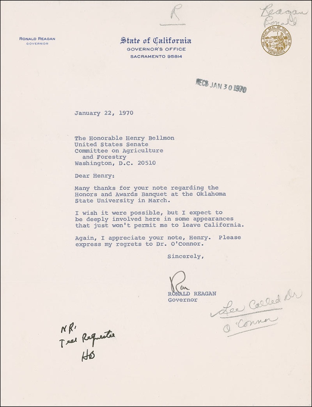 TLS signed “Ron,” one page, 8.5 x 11, State of California letterhead, January 22, 1970. Letter to Senator Henry Bellmon. In part, “Many thanks for your note regarding the Honors and Awards Banquet at the Oklahoma State University in March. I wish it were possible, but I expect to be deeply involved here in some appearances that just don’t permit me to leave California.” In fine condition, with several ink and pencil notations around text, and an office stamp near top. RRAuction COA.