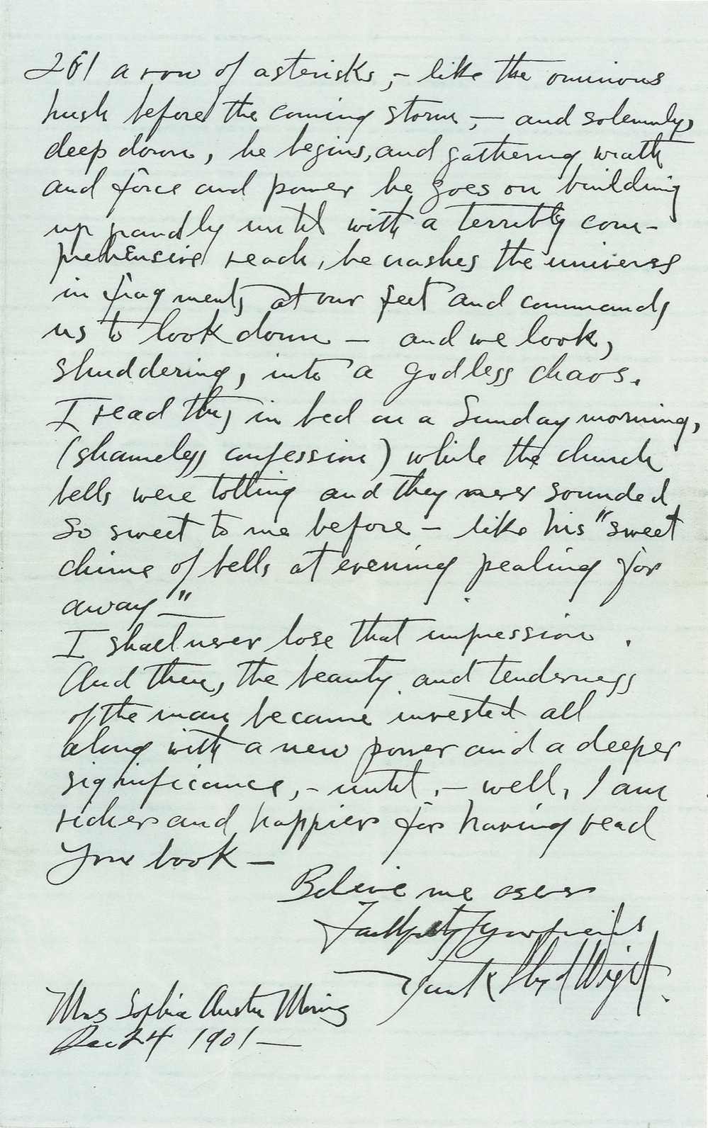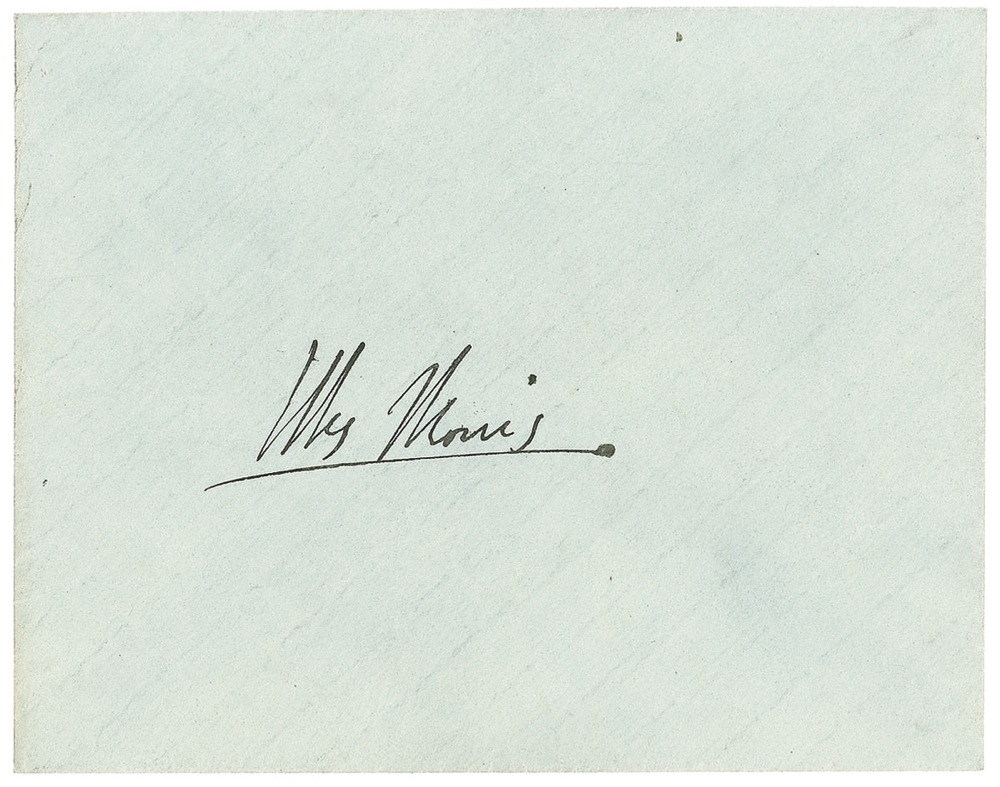 Highly influential American architect (1867–1959) whose mastery of space, form, and human-centered design revolutionized the field of architecture and earned him a place among the greatest thinkers and artists of the 20th century. Rare, early ALS, two pages, 5 x 8, December 24, 1901. Letter to Mrs. Sophia Morris. In full: “Majind insists upon the return of your Jean Paul, and kindly offers to carry him to you. He has gone with me to Hillside three different times and has been with me in all sorts of odd moments. I have read him—fruit, flowers and thorns and have read him of air.