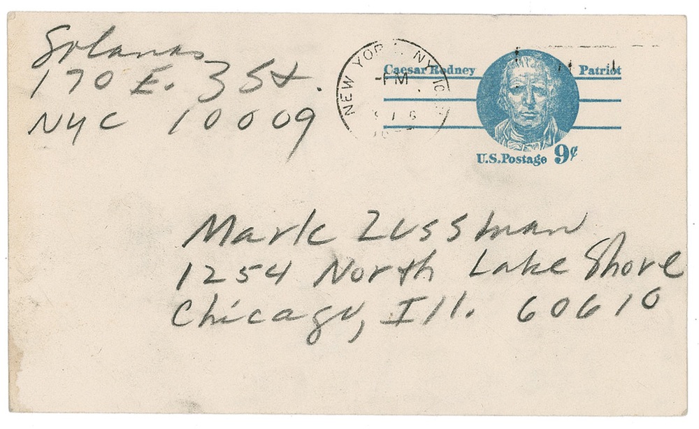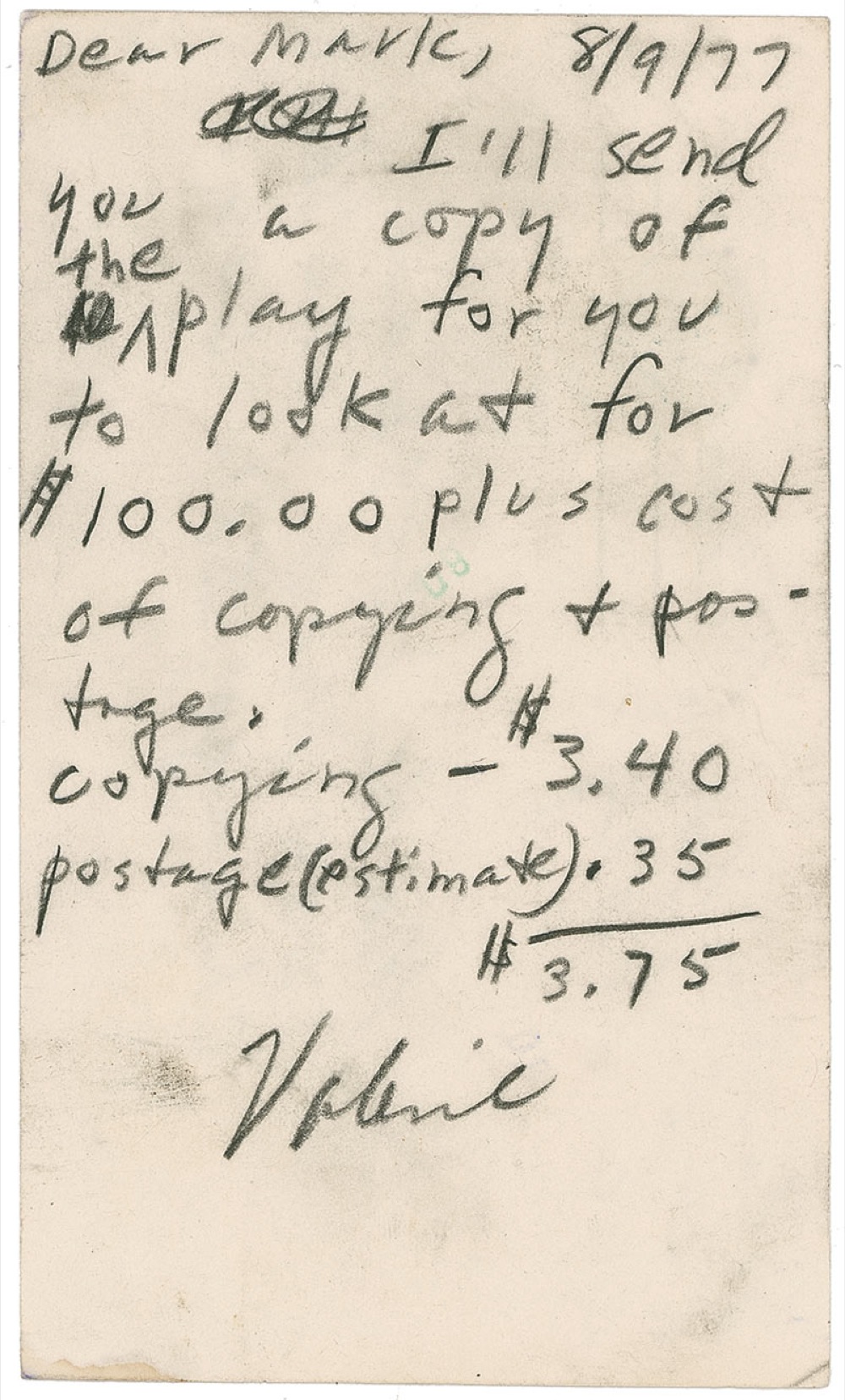 Radical feminist writer (1936–1988) best known for her attempted murder of Andy Warhol in 1968. ANS signed “Valerie” in pencil on the back of a postcard, 3.25 x 5.5, August 9, 1977. Solanas writes Mark Zussman, in full: “I’ll send you a copy of the play for you to look at for $100.00 plus cost of copying & postage.” She has then shown simple addition to estimate the additional cost to be $3.75. Solanas has addressed the postcard on the opposite side and signed in the return address area, “Solanas” along with her street address. In fine condition, with scattered pencil-related soiling. RRAuction COA.