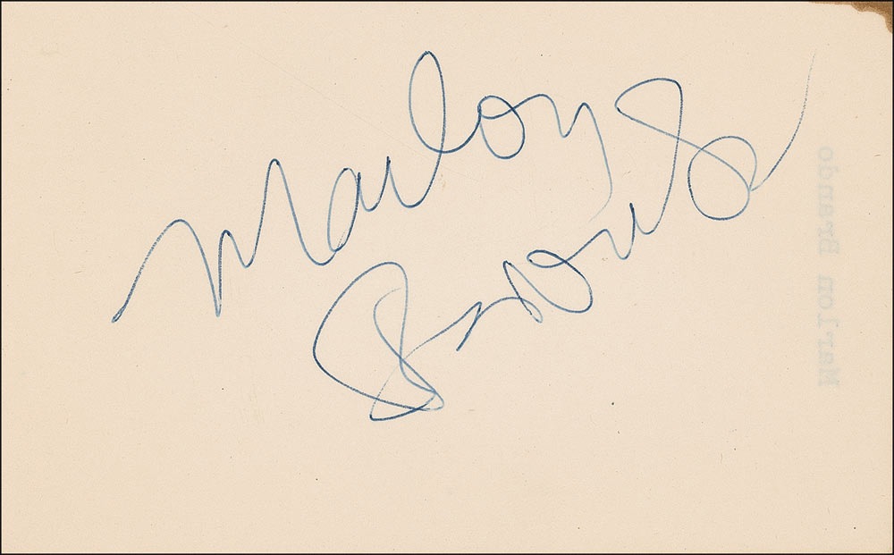 Vintage ballpoint signature, “Marlon Brando,” on an off-white 5 x 3 sheet. In fine condition, with a light vertical bend to left edge, and trivial toning to top right corner tip. Pre-certified PSA/DNA and RRAuction COA.