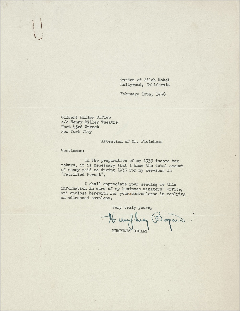 Very early TLS, one page, 8.5 x 11, February 10, 1936. Letter written from the Garden of Allah Hotel in Hollywood to the Gilber Miller Office at the Henry Miller Theatre. In full: “In the preparation of my 1935 income tax return, it is necessary that I know the total amount of money paid me during 1935 for my services in ‘Petrified Forest.’ I shall appreciate your sending me this information in care of my business manager’s office, and enclose herewith for your convenience in replying an addressed envelope.”