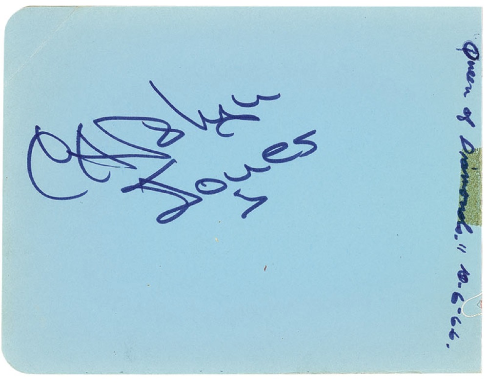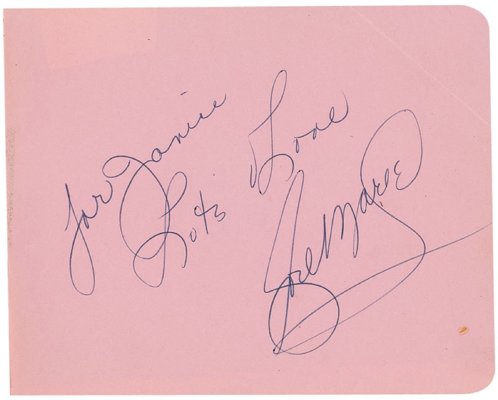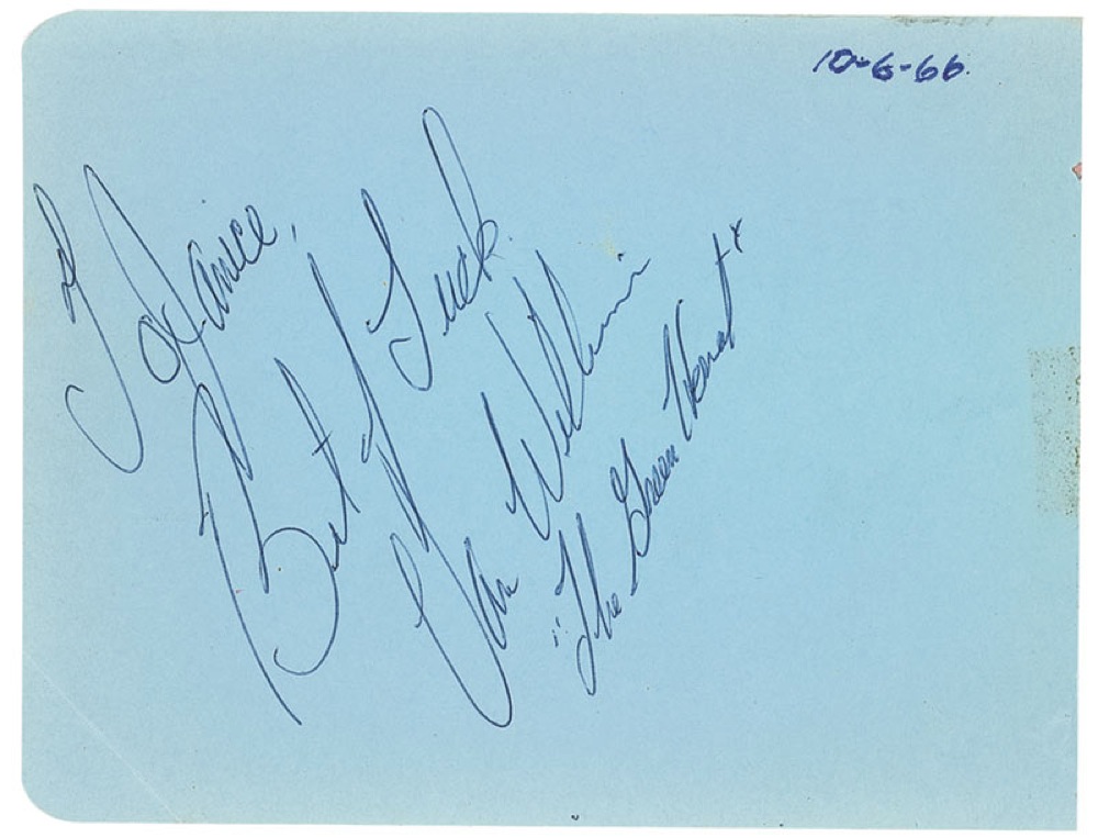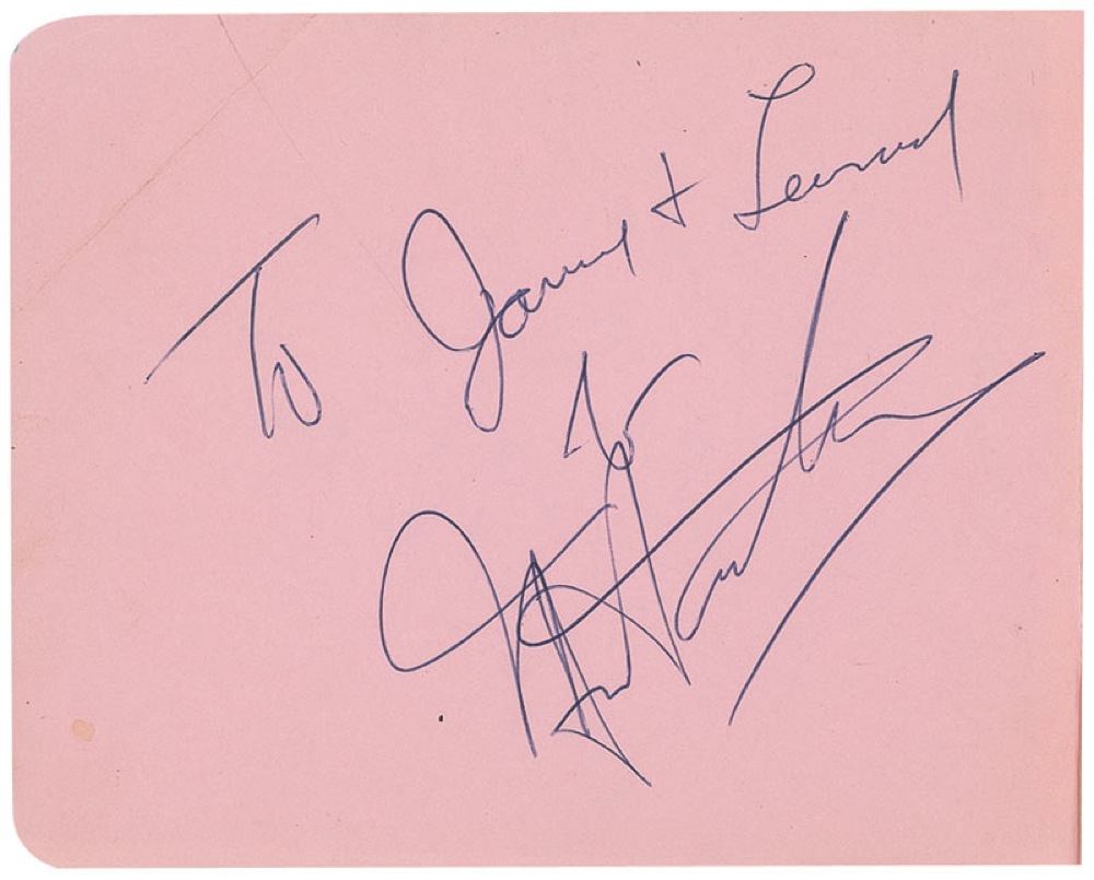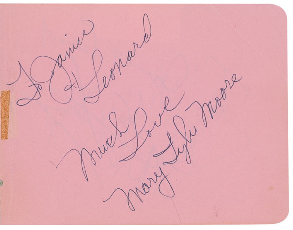 Vintage autograph album, 6 x 5, signed inside in ink by more than 20 entertainers, most single-page, with a few back-to-back and most inscribed to Janis. Signers include: Ray Walston (adding a sketch of a Martian), Bill Bixby, Mike Nesmith, Micky Dolenz, Sal Mineo, Carl Reiner, Dick Van Dyke, Mary Tyler Moore, Morey Amerstam, Rose Marie, Dan Rowan and Dick Martin, Adam West, (adding “Batman”), Burt Ward (adding “Robin”), Julie Newmar, Van Williams (adding “The Green Hornet”), Carolyn Jones, Frankie Avalon, Herman (from Herman’s Hermits), Don Adams (on a separate postcard), and Vin Scully. In very good condition, with all of the pages loose and old tape remnants on most pages. RRAuction COA.
